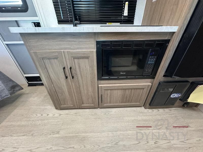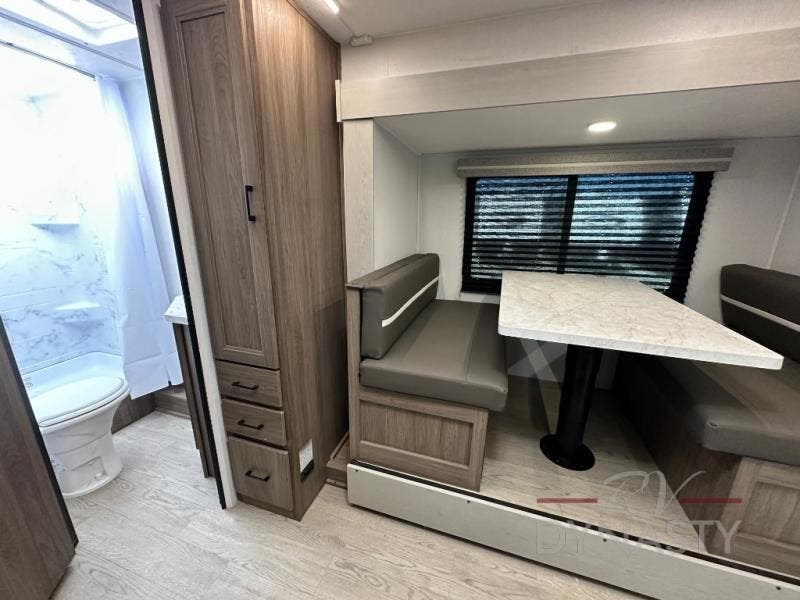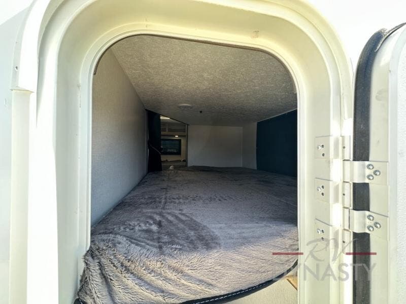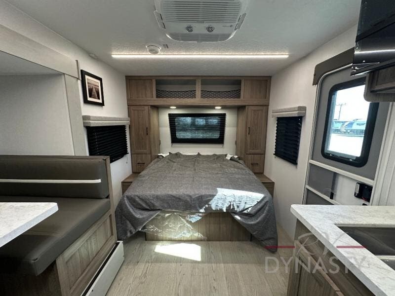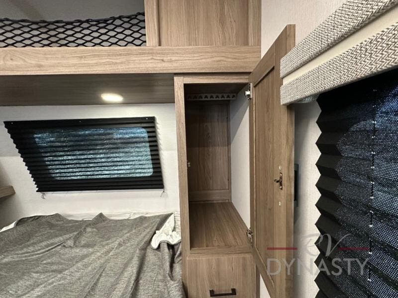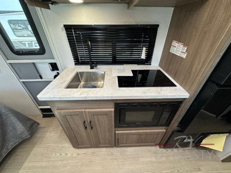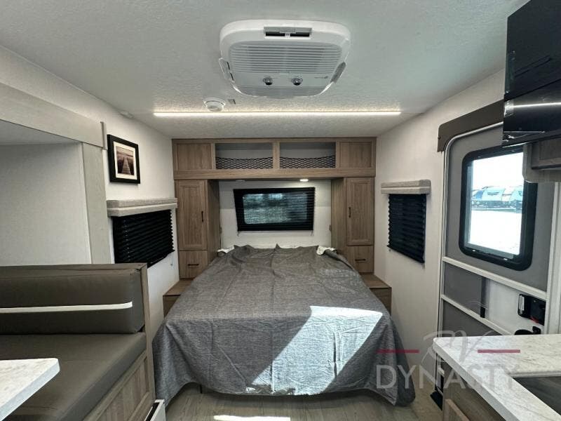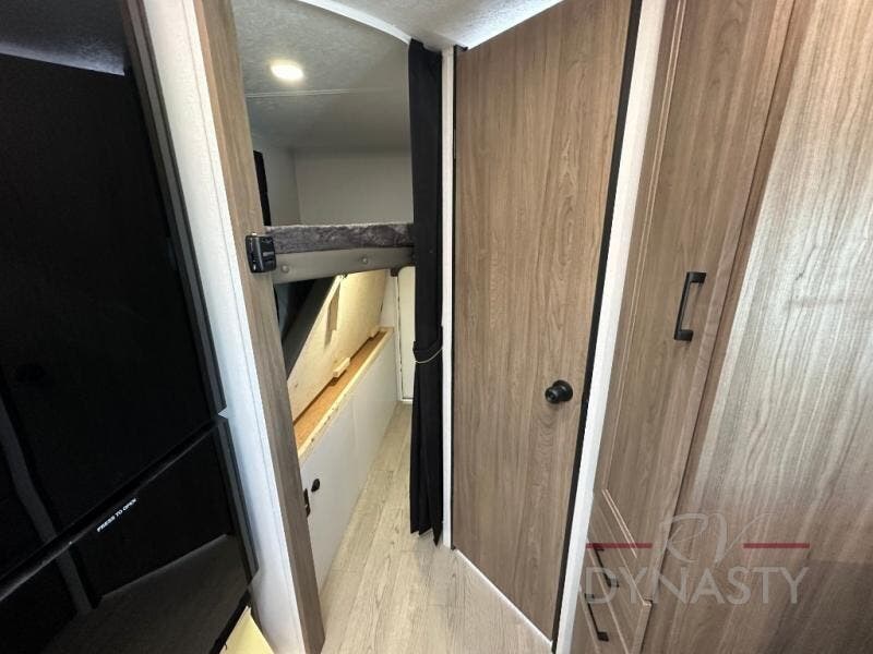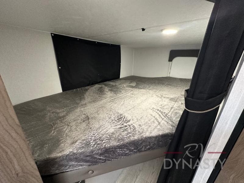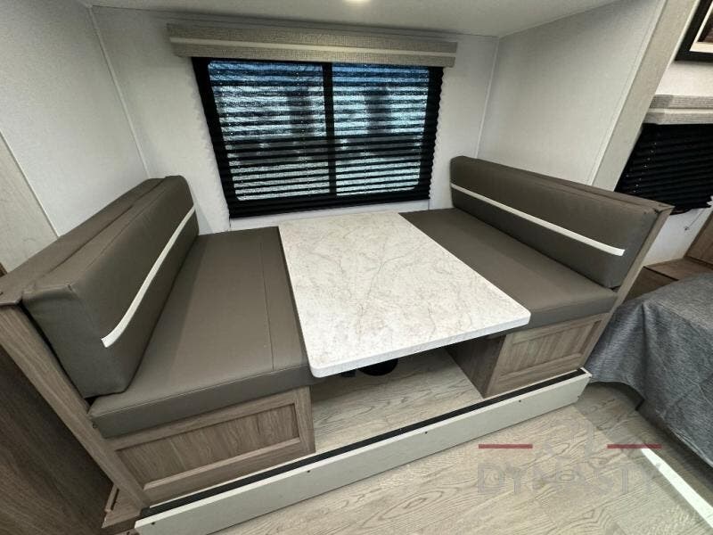 Camping with more friends and family is possible in this bunkhouse travel trailer! There is a double-size top bunk plus a double-size lower flip-up bunk for comfy sleeping space and additional storage space. You'll find your own bed up front with underbed storage and dual wardrobes to keep clothes wrinkle-free. Since there is a booth dinette slide out, you'll have additional interior space plus a place to dine, play games, and even let an extra guest sleep over. The full kitchen includes a dual burner cooktop and microwave oven to cook meals each day, along with a pantry and 12V refrigerator for food storage. And a full bath on board means you won't have to use the camp's facilities to freshen up each day; how convenient!