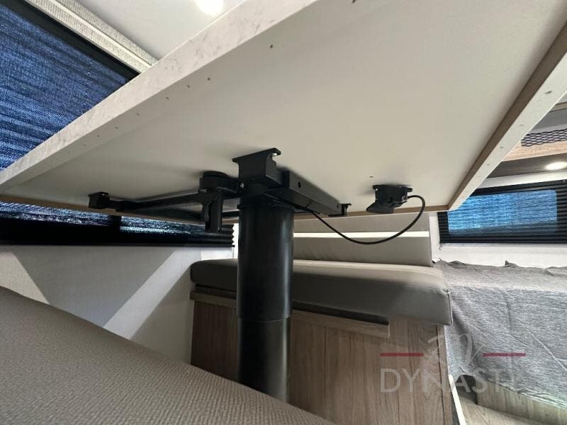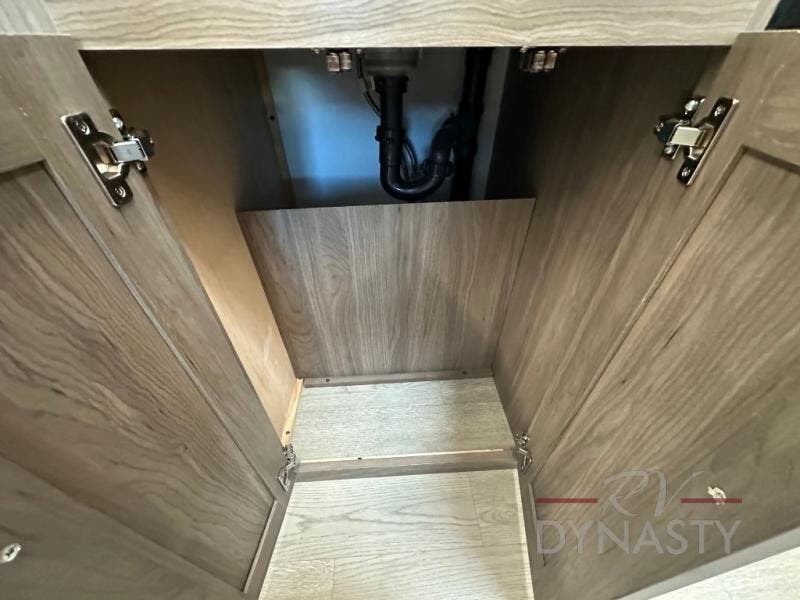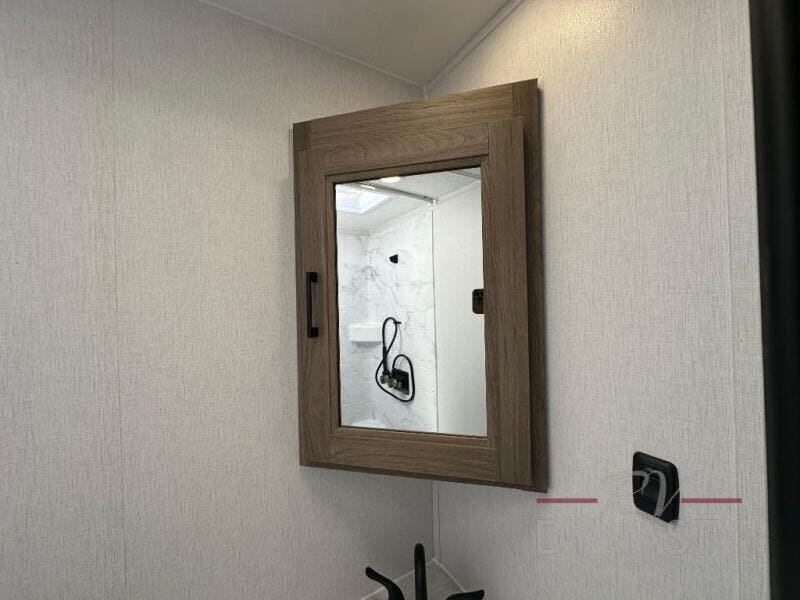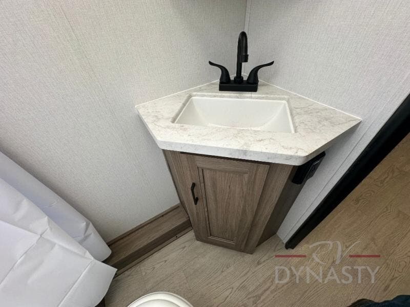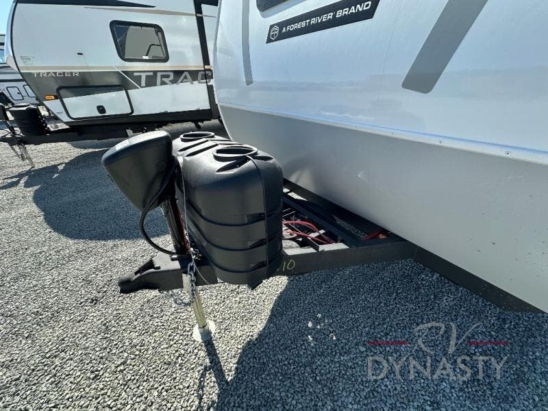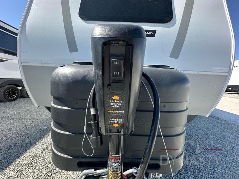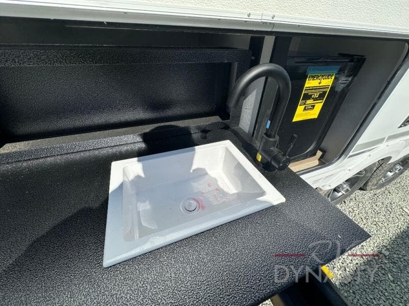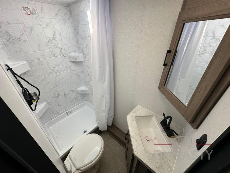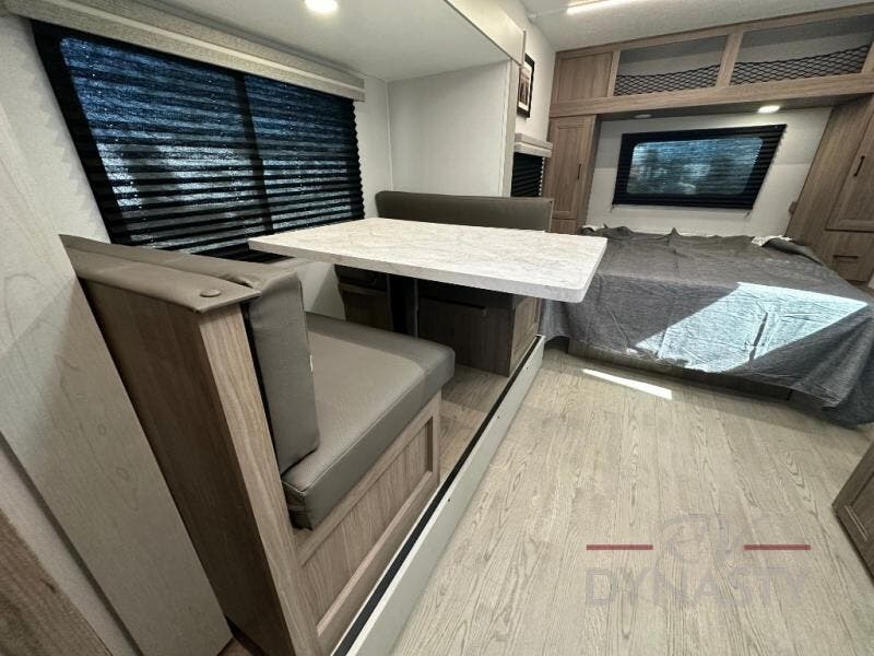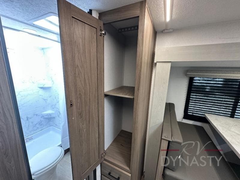 Camping with more friends and family is possible in this bunkhouse travel trailer! There is a double-size top bunk plus a double-size lower flip-up bunk for comfy sleeping space and additional storage space. You'll find your own bed up front with underbed storage and dual wardrobes to keep clothes wrinkle-free. Since there is a booth dinette slide out, you'll have additional interior space plus a place to dine, play games, and even let an extra guest sleep over. The full kitchen includes a dual burner cooktop and microwave oven to cook meals each day, along with a pantry and 12V refrigerator for food storage. And a full bath on board means you won't have to use the camp's facilities to freshen up each day; how convenient!