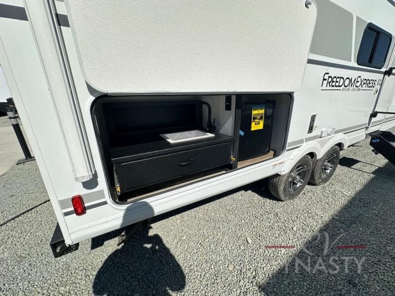 With any Freedom Express Select travel trailer by Coachmen you will find an alumicage construction and vacuum bonded walls with Azdel composite for a trailer made to last. These Select value models come standard with a Bluetooth interior speaker, night shades, and wear-resistant vinyl flooring throughout. You will appreciate the power tongue jack, as well as the Tufflex PVC roof and heated and enclosed underbelly to extend your camping season. A 15K BTU roof A/C will keep you comfortable, and the tankless water heater will provide endless hot showers!