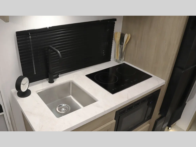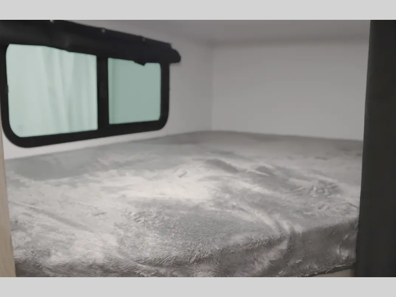 Camping with more friends and family is possible in this bunkhouse travel trailer! There is a double-size top bunk plus a double-size lower flip-up bunk for comfy sleeping space and additional storage space. You'll find your own bed up front with underbed storage and dual wardrobes to keep clothes wrinkle-free. Since there is a booth dinette slide out, you'll have additional interior space plus a place to dine, play games, and even let an extra guest sleep over. The full kitchen includes a dual burner cooktop and microwave oven to cook meals each day, along with a pantry and 12V refrigerator for food storage. And a full bath on board means you won't have to use the camp's facilities to freshen up each day; how convenient!