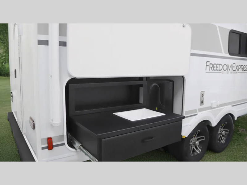 With any Freedom Express Select travel trailer by Coachmen you will find an alumicage construction and vacuum bonded walls with Azdel composite for a trailer made to last. These Select value models come standard with a Bluetooth interior speaker, night shades, and wear-resistant vinyl flooring throughout. You will appreciate the power tongue jack, as well as the Tufflex PVC roof and heated and enclosed underbelly to help with protection and climate control. A 15K BTU roof A/C will keep you comfortable, and the tankless water heater will provide endless hot showers!