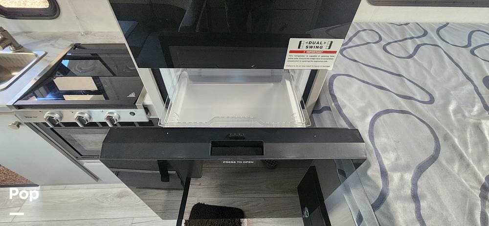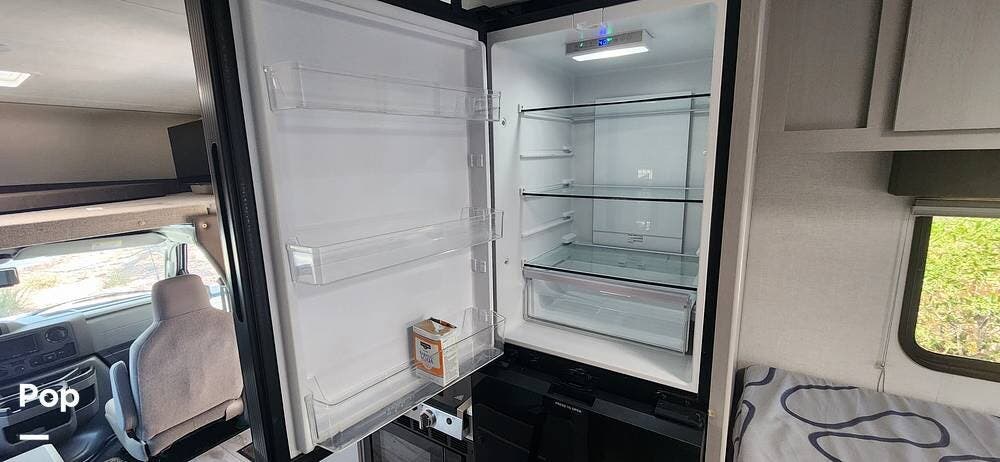 The kitchen is practical, with a three‑burner cooktop, microwave, and a 10-10.7 cu ft 12V refrigerator. It also has solid-surface countertops, plenty of cabinet space, and a swing-arm TV in the cab for checking the weather or streaming.