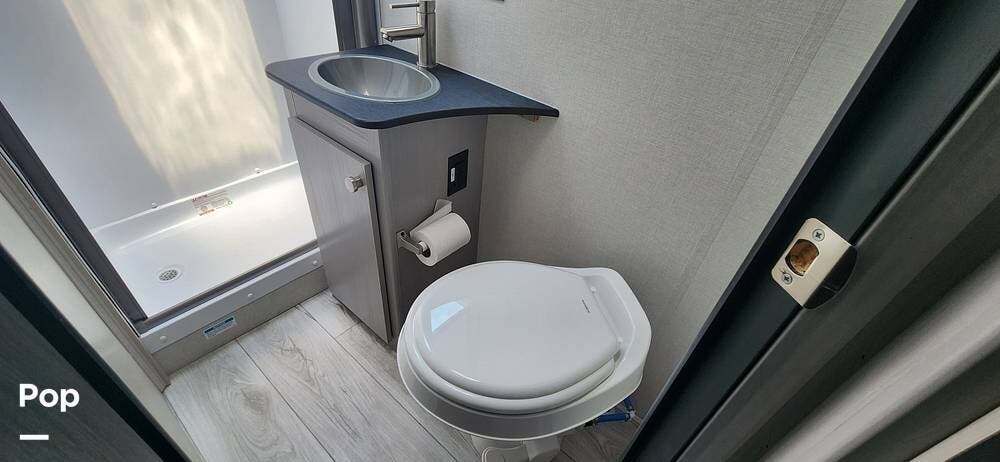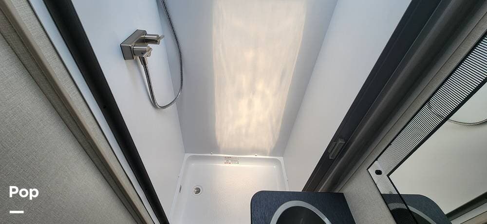 The full bathroom is in the rear corner and includes a 24"32" shower, toilet, and vanity--roomy enough for ease of use.