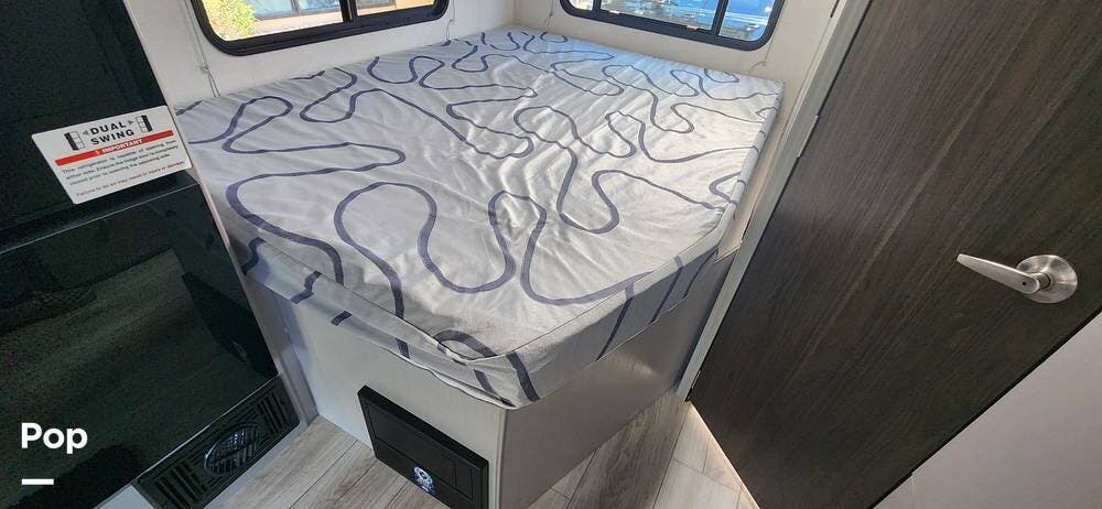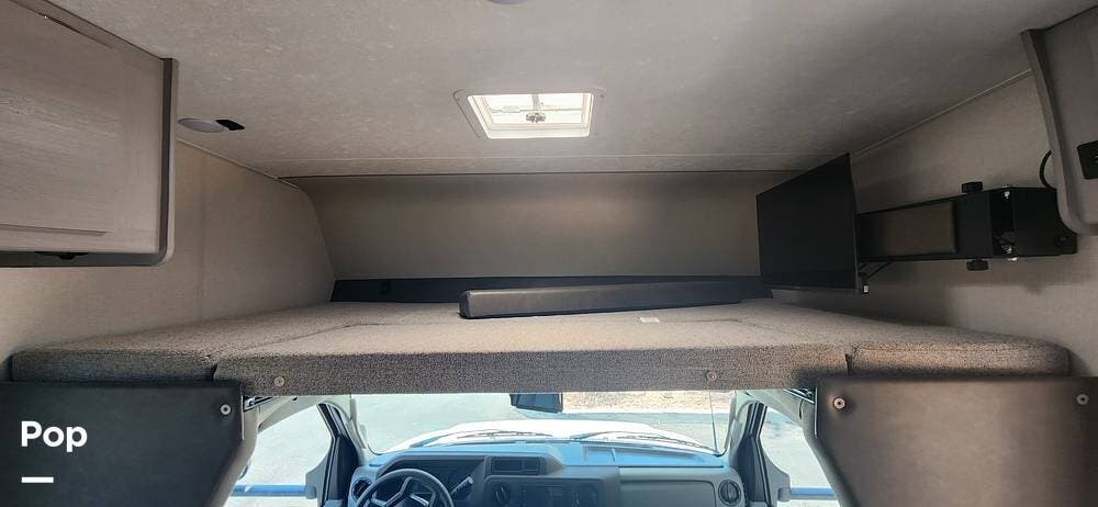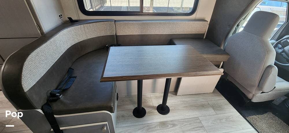 Inside, it sleeps up to six. That includes a queen bed in the back, a J-lounge with a pedestal table, and a bunk over the cab.