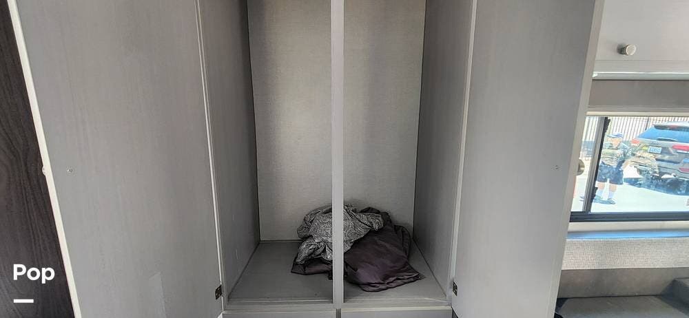 The coach also includes a 15 ,000 BTU A/C, a 5 000 lb. tow hitch out back, and a 15′ power awning with LED strip lighting.