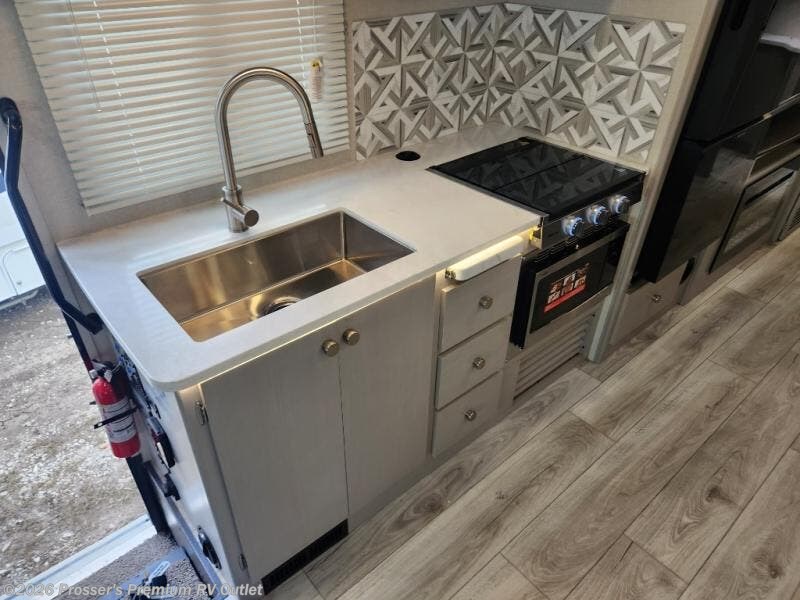 This motorhome is designed for ultimate versatility! It features a 72" x 74" Murphy bed that transforms into an 84" sofa for daytime lounging. Opposite the bed, you'll find a 40" Smart TV with an optional fireplace below, as well as hookups for an optional washer and dryer. The 57" x 80" bunk over the cab provides extra sleeping or storage space, and the 44" x 82" U-shaped dinette can also be converted into an additional bed. The fully equipped kitchen includes a pull-out countertop extension for easier meal prep, and there's even an outdoor kitchen for cooking in the fresh air!