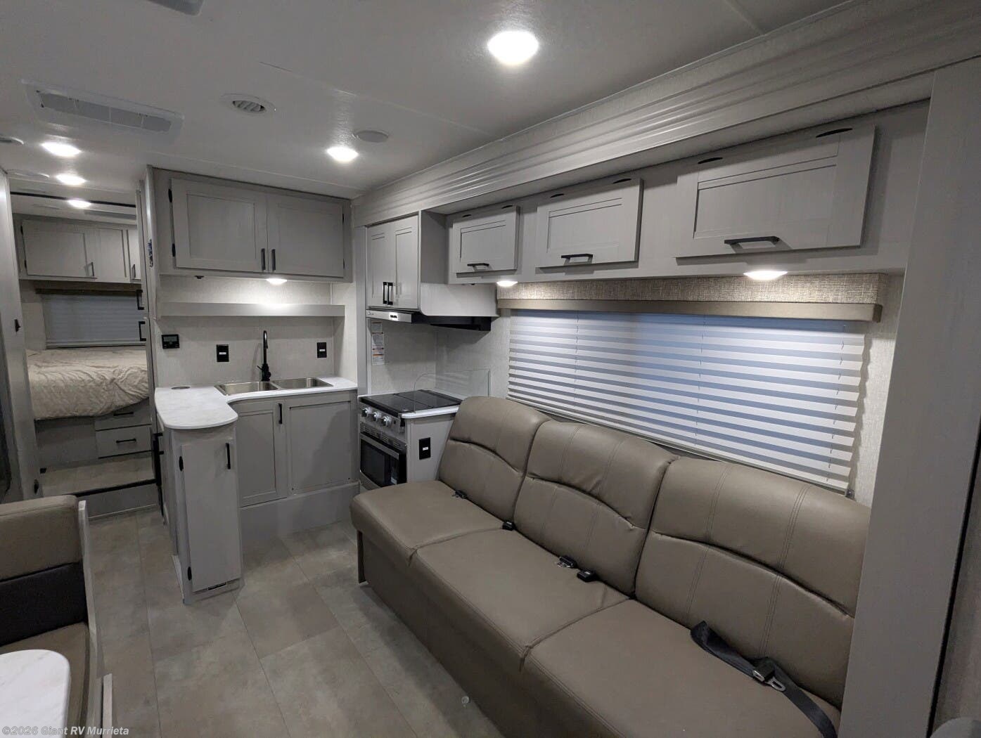 - Open Living Area featuring a standard booth dinette and a full cab-over bunk, offering multiple seating and sleeping options for families or guests.