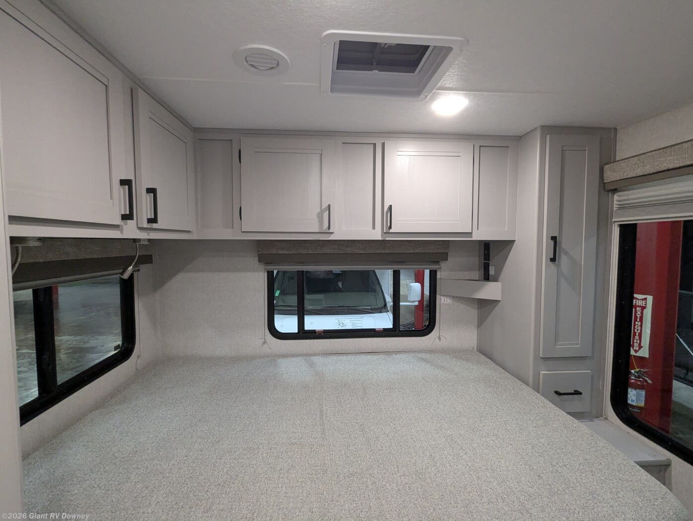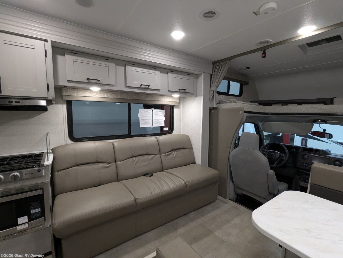 - Open Living Area featuring a standard booth dinette and a full cab-over bunk, offering multiple seating and sleeping options for families or guests.