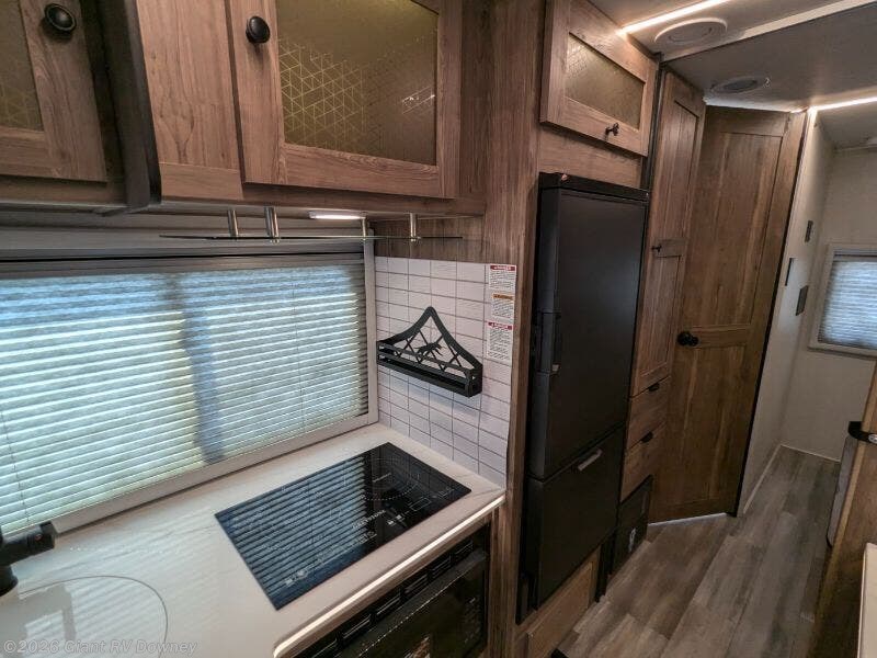 - Modern Kitchen: Features a mid-size refrigerator, 2-burner induction cooktop, convection microwave, and solid surface countertops.