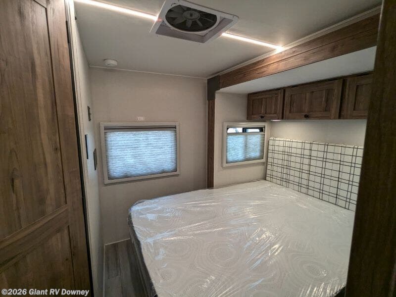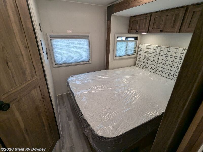 - Queen Bed Slide: Private rear bedroom with a 60" x 80" RV queen bed, wardrobe, and nightstand, sleeping up to 5 with a 36" x 76" cab-over bunk.