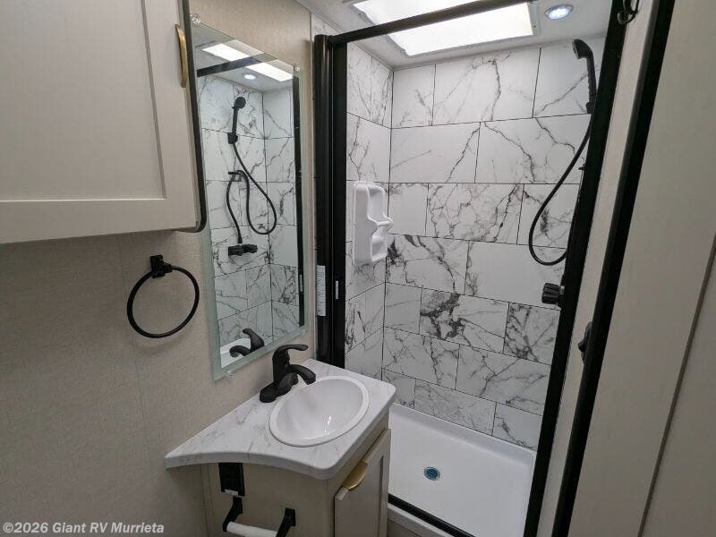 - Modern Kitchen: Features a 12V refrigerator, 2-burner induction cooktop, convection microwave, and thermofoil countertops.