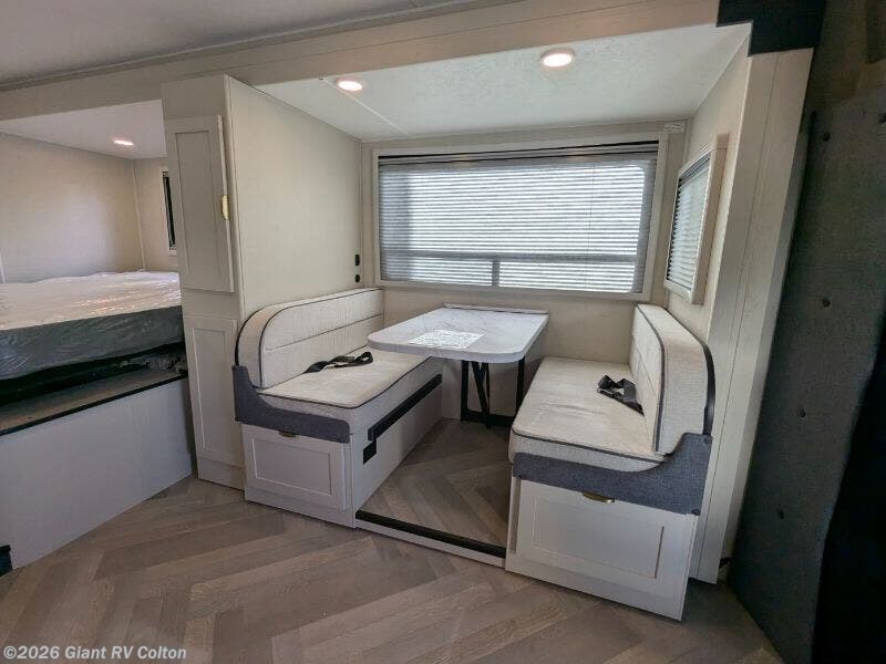 - Full-Wall Slide: Spacious living area with a U-shaped dinette, recliners, and 28" Smart TV for cozy gatherings.