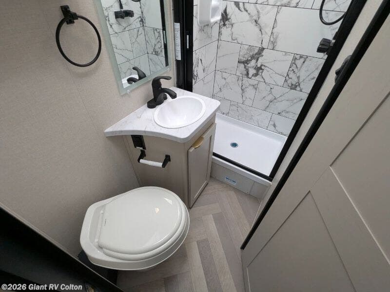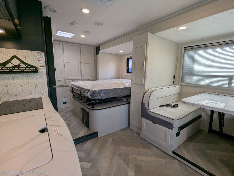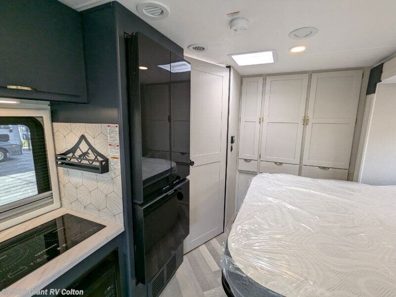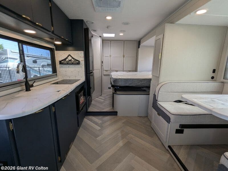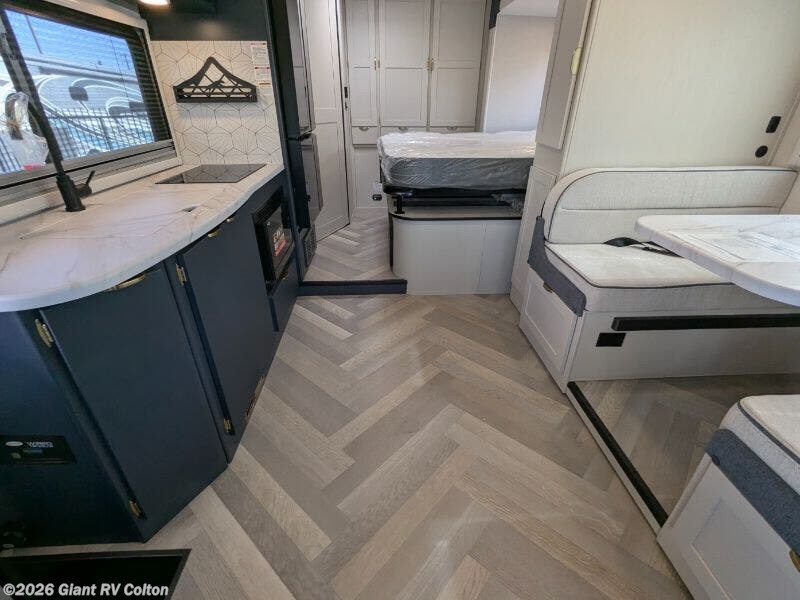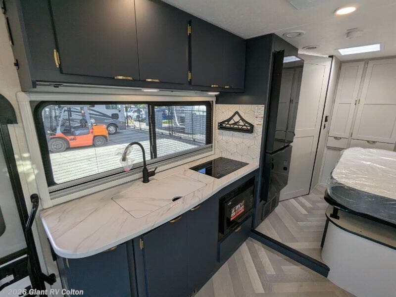 - Modern Kitchen: Features a 12V refrigerator, 2-burner induction cooktop, convection microwave, and thermofoil countertops.