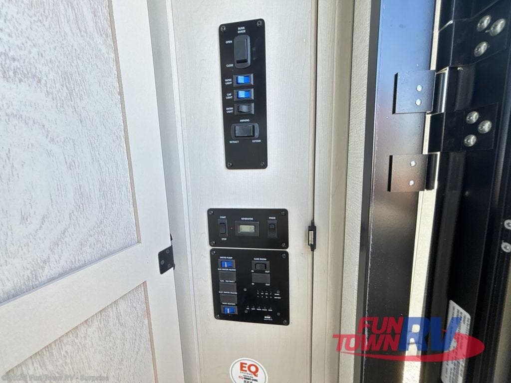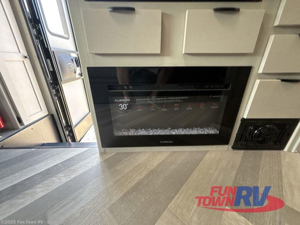 You will enjoy the versatility that this Murphy bed model provides. Depending on whether it is daytime or evening will determine if you have a 60" x 74" bed that slides out or a 62" sofa to enjoy. There is a 45" x 76" cab over bunk that can be used for added sleeping for two more guests, or used as added storage space. The rear full bath is spacious and private and includes a 32" x 32" angled shower, toilet, vanity with sink, plus linen cabinet, and wardrobe. The kitchen features everything needed to create meals while on the go, and a cozy fireplace is included beneath the coach TV for your enjoyment. Outside, you will find a second TV beneath the armless awning so you can enjoy watching your favorite movies and games whenever you like.