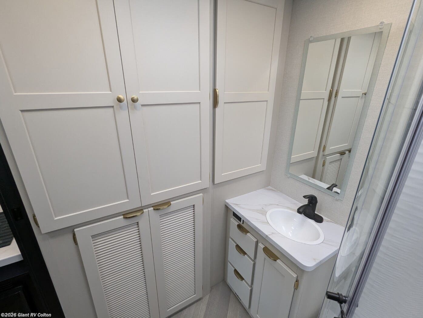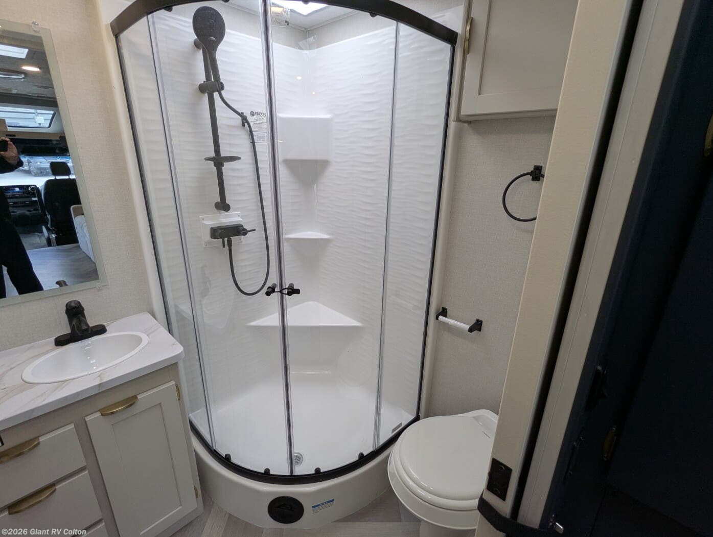 - Rear Full Bath: Spacious bathroom with a 32" x 32" angled shower, vanity, linen cabinet, and wardrobe for convenience.