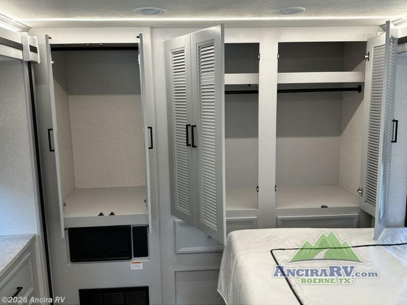 You will love how much space you have in this coach thanks to the four slide outs, plus you can sleep up to six with the added drop-down overhead bunk. Your crew can get comfortable on the 78" sofa by the fireplace and 40" TV, or play a game at the booth dinette. You can choose the optional theater seating in place of the sofa if you don't need the additional sleeping space. This models features a two burner induction cooktop, a stainless steel microwave, plus a pantry for dry goods and snacks. Within the full bath you'll find shower skylight for more natural light and a medicine cabinet to keep your things organized. The rear private bedroom is designed to make you feel at home with its two wardrobes, king bed slide out, and 32" LED TV. One of the wardrobes even includes washer and dryer prep to make going full-time easy as 1-2-3!