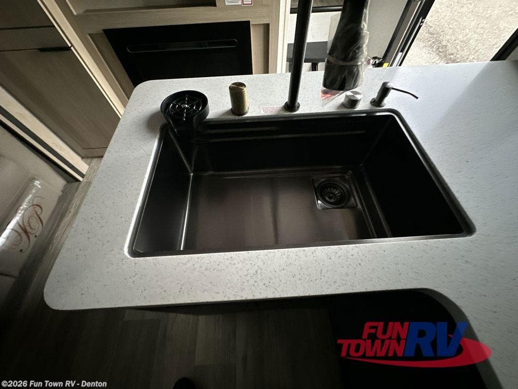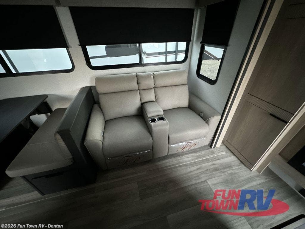 If you've been dreaming of camping with friends and family, take a look at this fifth wheel that can sleep nine people each night. The little ones will spend their time in the private bunkhouse when they're not outside riding their bikes. The half bath includes its own exterior entry door so your guests won't drag dirt through the whole trailer just to use the restroom, and the second entry door conveniently leads into the main living area. Here, you can relax on the booth dinette and tri-fold sofa within the large slide out, and if you're wanting even more comfort, just choose the optional power theatre seats in place of the tri-fold sofa. You will find all the appliances indoors to prepare meals each day, plus there is an exterior kitchen that will be perfect when frying fish or bacon!