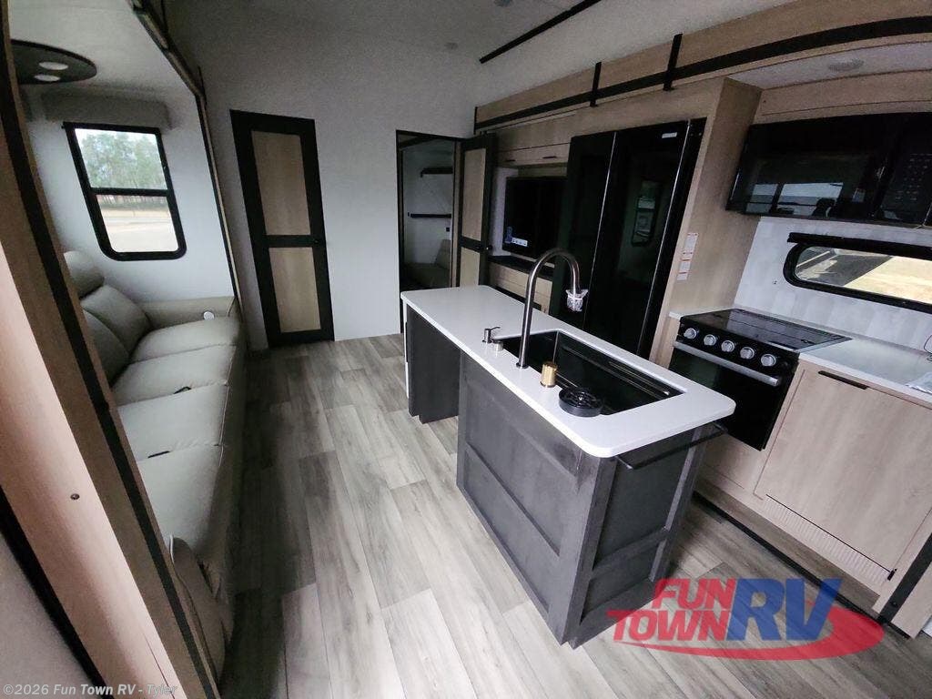 If you enjoy camping with a larger group of family or friends, this fifth wheel is perfect for you! Since there are two full baths, a front private bedroom, and a private bunkhouse suite, everyone can have their own space! The king bed slide in the front bedroom is sure to bring comfort, and you'll find a dresser and large front closet for your things. Washer and dryer prep is also found here if you want to add those appliances. The bunkhouse features a 38" x 74" bunk across from a jack knife sofa and second bunk bed plus a bunk mat under the sofa. There is also bunk mat above the full rear bath, allowing you to sleep five here! Everyone will love to meet in the combined kitchen and living room on the quad theater seat as the chef prepares dinner. A kitchen island with a flip-up island extension and two seats provides even more counter space, plus there are two pantries and a residential refrigerator for ample food storage. If the weather is nice, you may just find yourselves outdoors since there is an outside kitchen and 14' power awning with LED lights!