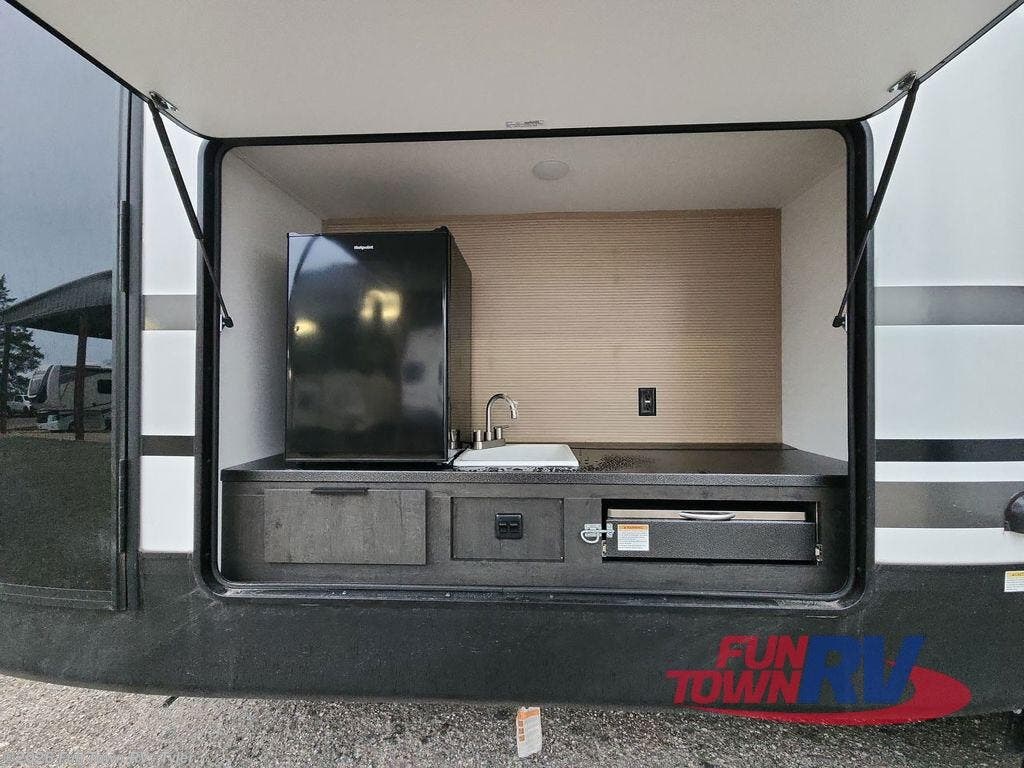 If you enjoy camping with a larger group of family or friends, this fifth wheel is perfect for you! Since there are two full baths, a front private bedroom, and a private bunkhouse suite, everyone can have their own space! The king bed slide in the front bedroom is sure to bring comfort, and you'll find a dresser and large front closet for your things. Washer and dryer prep is also found here if you want to add those appliances. The bunkhouse features a 38" x 74" bunk across from a jack knife sofa and second bunk bed plus a bunk mat under the sofa. There is also bunk mat above the full rear bath, allowing you to sleep five here! Everyone will love to meet in the combined kitchen and living room on the quad theater seat as the chef prepares dinner. A kitchen island with a flip-up island extension and two seats provides even more counter space, plus there are two pantries and a residential refrigerator for ample food storage. If the weather is nice, you may just find yourselves outdoors since there is an outside kitchen and 14' power awning with LED lights!