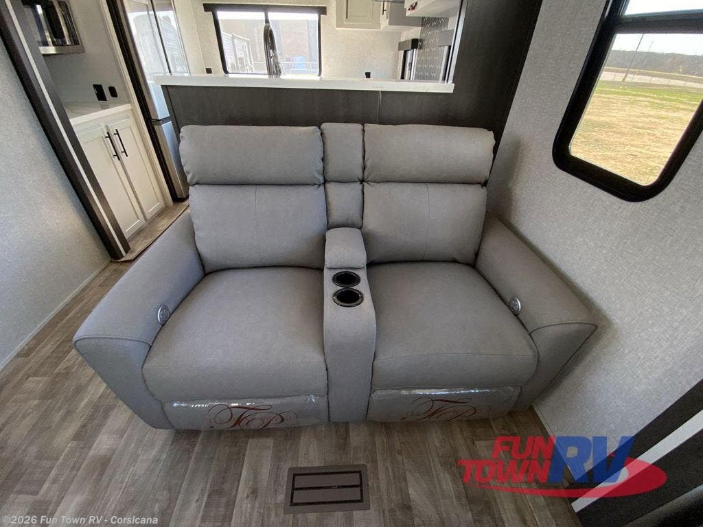 Extended stays in this destination trailer are made complete with family and friends. The chef of your group will love the spacious rear kitchen with plenty of overhead cabinets, a pantry/cabinet, plus a four burner cooktop. Everyone can be visiting in the middle living room while dinner is being made. Here, you'll find a hide-a-bed sofa, theater seating, plus fireplace with a 50" TV. The full bath lets you clean up each day, and the front private bedroom will feel just like home with a king bed slide out and tons of storage space for your necessities.