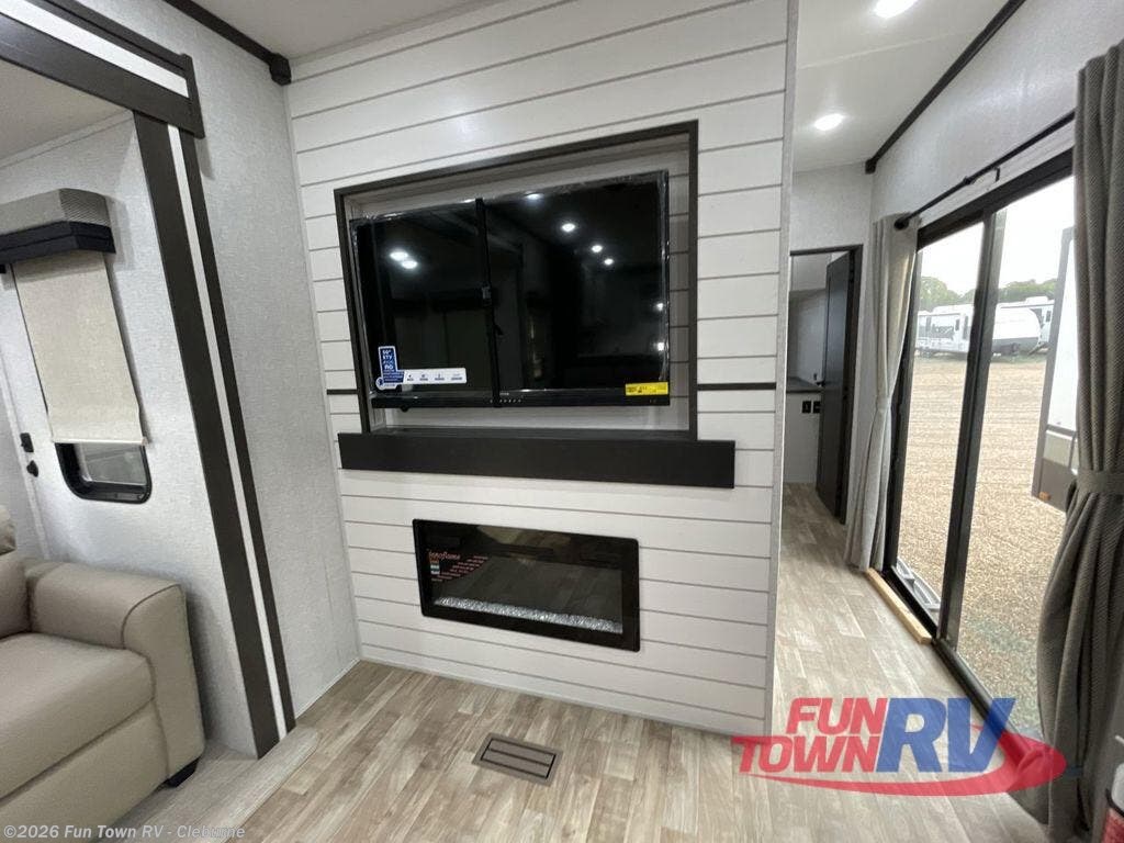 Extended stays in this destination trailer are made complete with family and friends. The chef of your group will love the spacious rear kitchen with plenty of overhead cabinets, a pantry/cabinet, plus a four burner cooktop. Everyone can be visiting in the middle living room while dinner is being made. Here, you'll find a hide-a-bed sofa, theater seating, plus fireplace with a 50" TV. The full bath lets you clean up each day, and the front private bedroom will feel just like home with a king bed slide out and tons of storage space for your necessities.