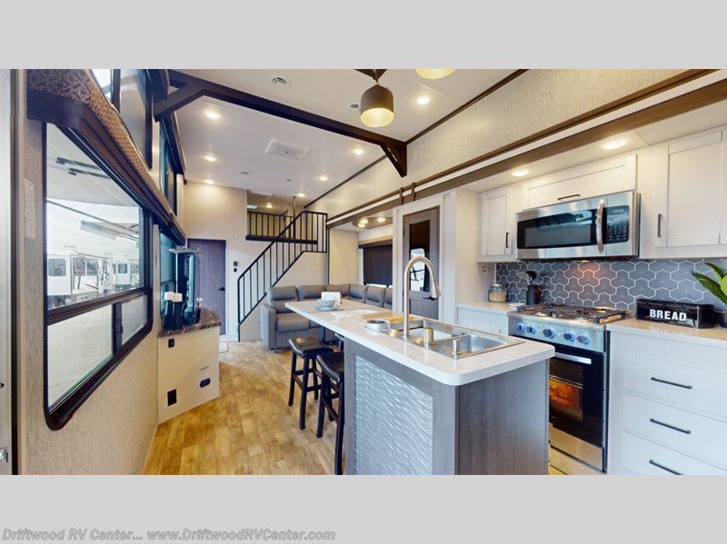 There are plenty of sleeping spots in this destination trailer! Starting with the front private bedroom that has a king bed slide across from a dresser, a closet, and just outside the entrance is a set of spiral stairs leading to one of the two loft areas. This loft above the bedroom has three 38" x 74" bunk mats, a TV, and a cubby for your belongings. The second loft has a 60" x 80" bunk mat and is above the full rear bathroom which features a 48" shower for everyone to freshen up in as well as an area prepped to add the optional washer and dryer for clean clothes throughout your entire stay. The dual entry doors make it easy to enter and exit this unit, plus one of them is a set of patio doors to add even more natural lighting. The chef will have an easy time preparing delicious meals with the kitchen island, and at night everyone can relax on the L-shaped sofa across from the entertainment center featuring a fireplace and 50" LED HDTV!
