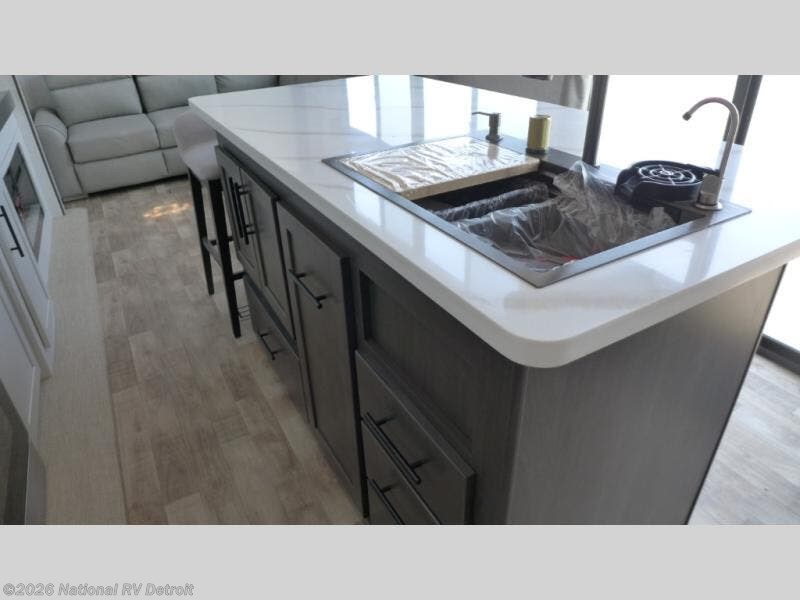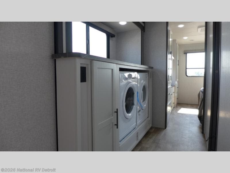 You'll love every minute spent in this spacious destination trailer. There is a front living area with an L-shaped sofa, a 65" TV plus a fireplace to make it feel more like home. You will find a large kitchen island with four stools where you can dine together each day. The kitchen also includes a pantry, closet, hutch, and overhead cabinets for tons of storage space. The full bath includes dual bath sinks and a spacious 48" shower, and right across the hall is a slide out with space for a washer/dryer. Head to the rear private bedroom where you can sleep soundly on the king bed slide out and keep your items organized in the dresser and wardrobes. And outside, you'll find five baggage doors so nothing gets left behind!