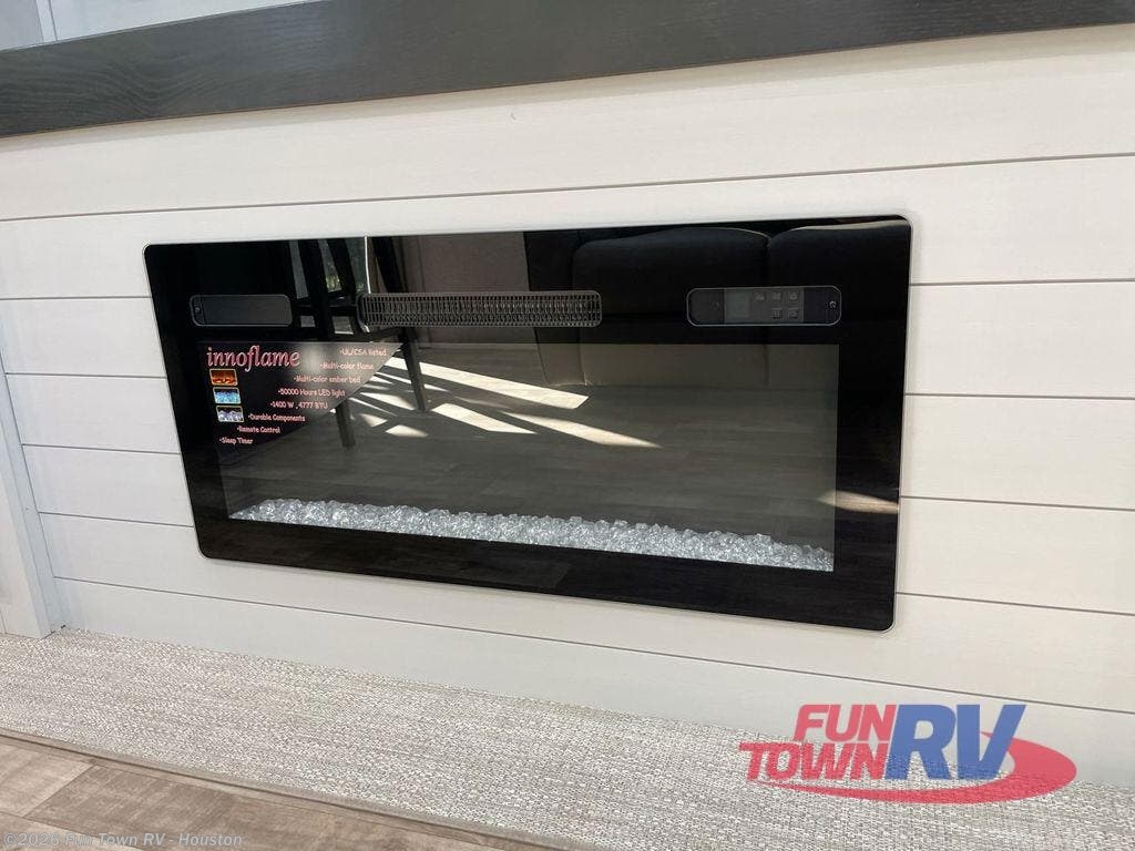 You'll love every minute spent in this spacious destination trailer. There is a front living area with an L-shaped sofa, a 65" TV plus a fireplace to make it feel more like home. You will find a large kitchen island with four stools where you can dine together each day. The kitchen also includes a pantry, closet, hutch, and overhead cabinets for tons of storage space. The full bath includes dual bath sinks and a spacious 48" shower, and right across the hall is a slide out with space for a washer/dryer. Head to the rear private bedroom where you can sleep soundly on the king bed slide out and keep your items organized in the dresser and wardrobes. And outside, you'll find five baggage doors so nothing gets left behind!