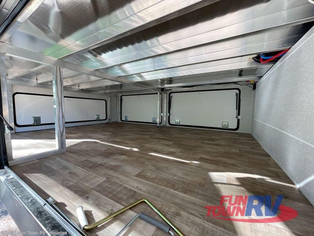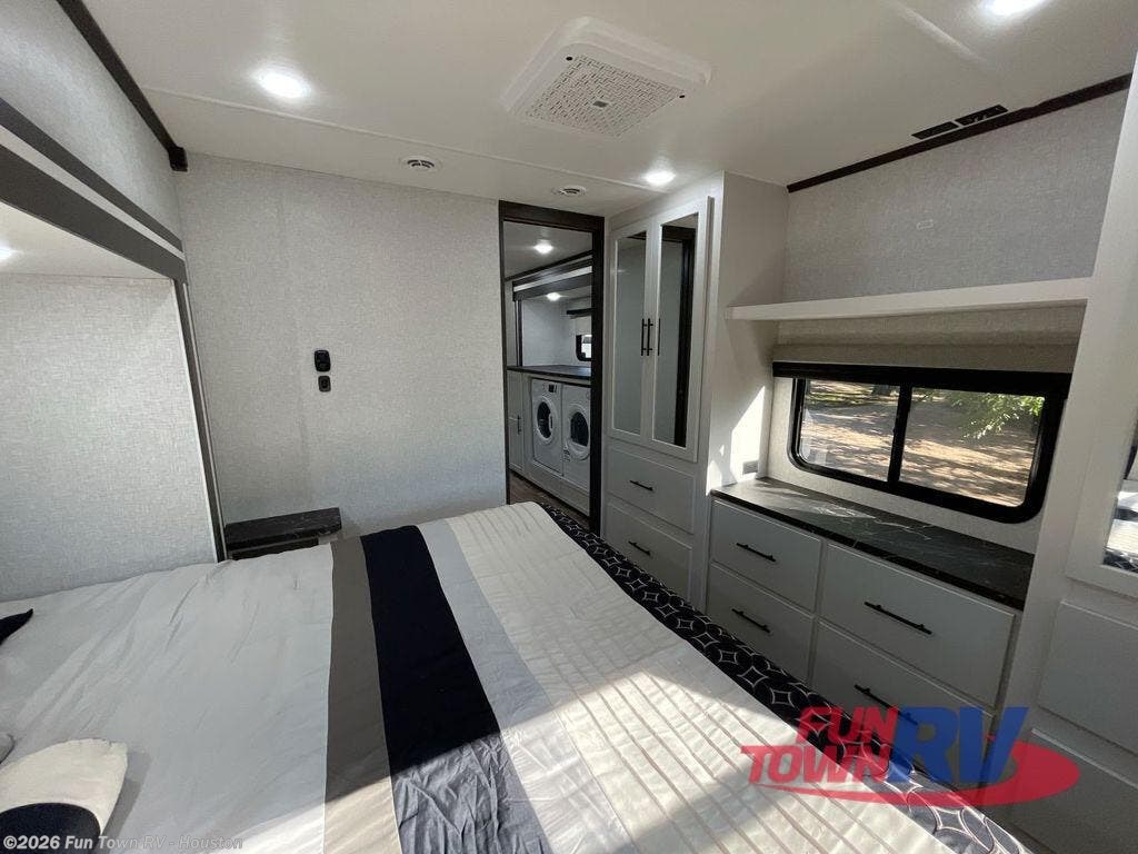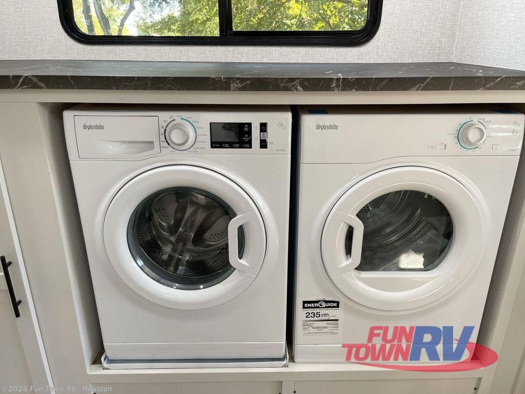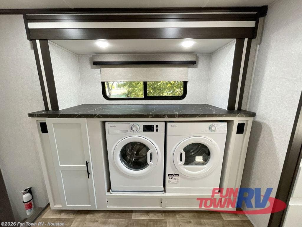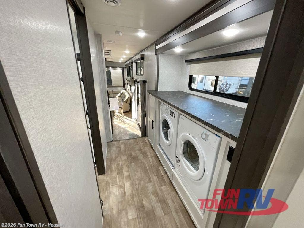 You'll love every minute spent in this spacious destination trailer. There is a front living area with an L-shaped sofa, a 65" TV plus a fireplace to make it feel more like home. You will find a large kitchen island with four stools where you can dine together each day. The kitchen also includes a pantry, closet, hutch, and overhead cabinets for tons of storage space. The full bath includes dual bath sinks and a spacious 48" shower, and right across the hall is a slide out with space for a washer/dryer. Head to the rear private bedroom where you can sleep soundly on the king bed slide out and keep your items organized in the dresser and wardrobes. And outside, you'll find five baggage doors so nothing gets left behind!