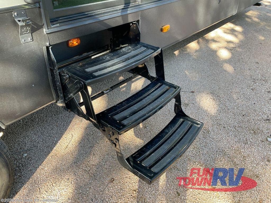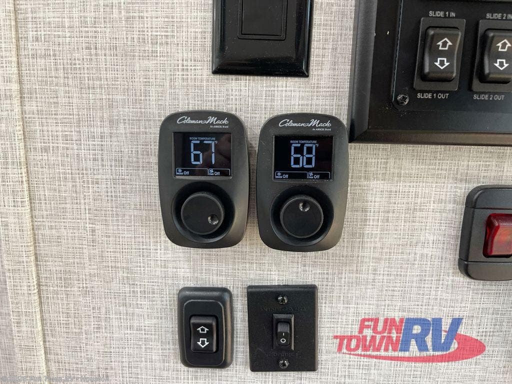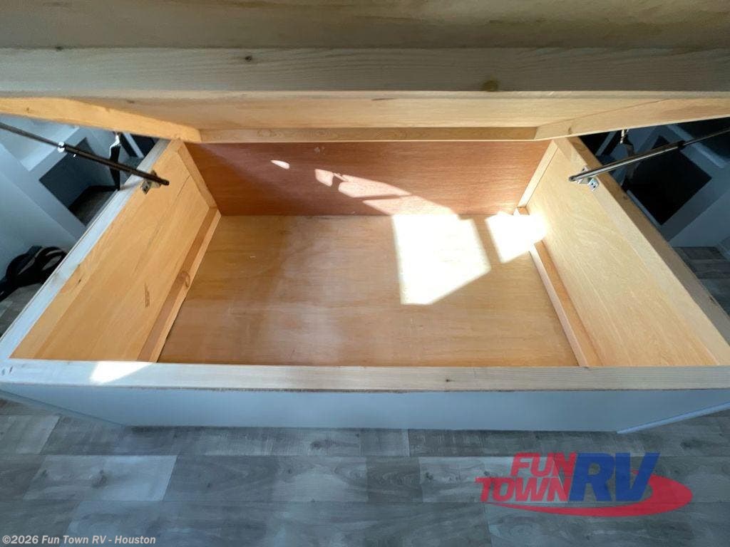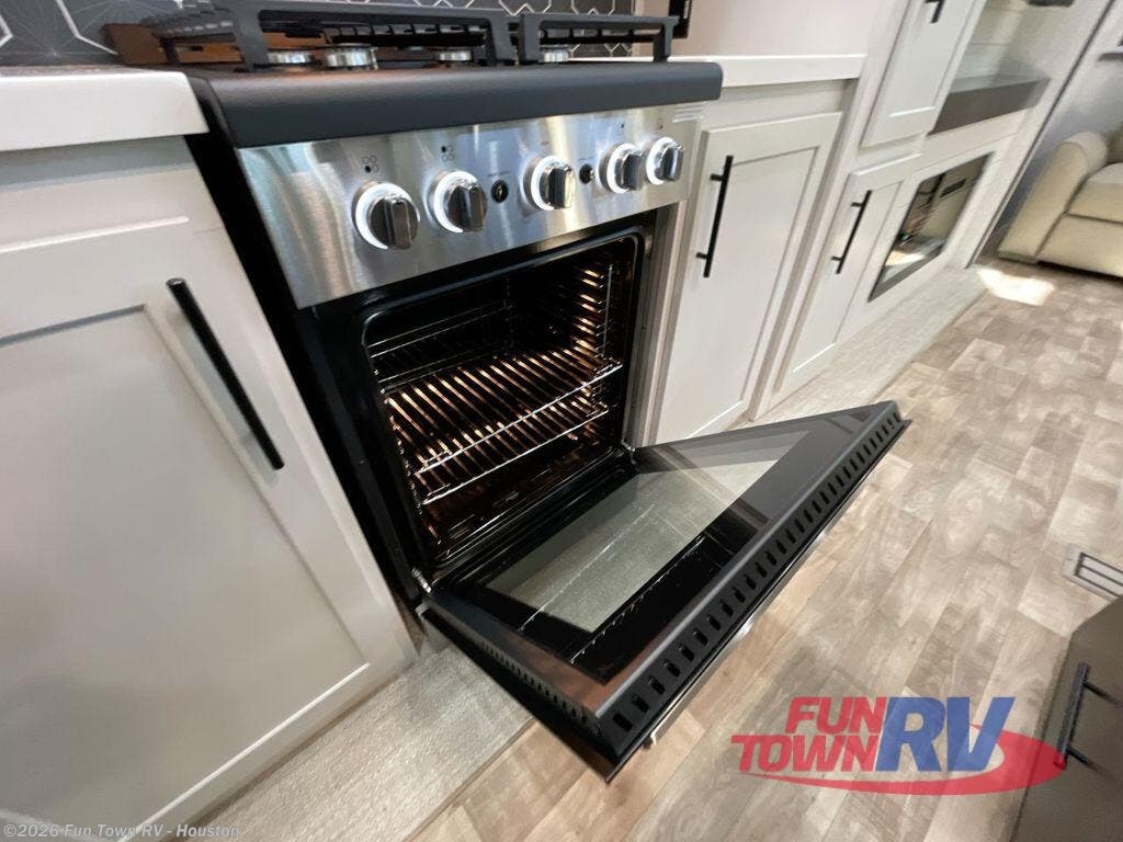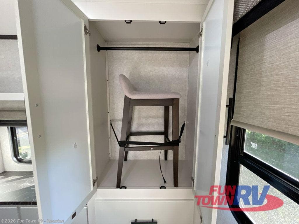 You'll love every minute spent in this spacious destination trailer. There is a front living area with an L-shaped sofa, a 65" TV plus a fireplace to make it feel more like home. You will find a large kitchen island with four stools where you can dine together each day. The kitchen also includes a pantry, closet, hutch, and overhead cabinets for tons of storage space. The full bath includes dual bath sinks and a spacious 48" shower, and right across the hall is a slide out with space for a washer/dryer. Head to the rear private bedroom where you can sleep soundly on the king bed slide out and keep your items organized in the dresser and wardrobes. And outside, you'll find five baggage doors so nothing gets left behind!