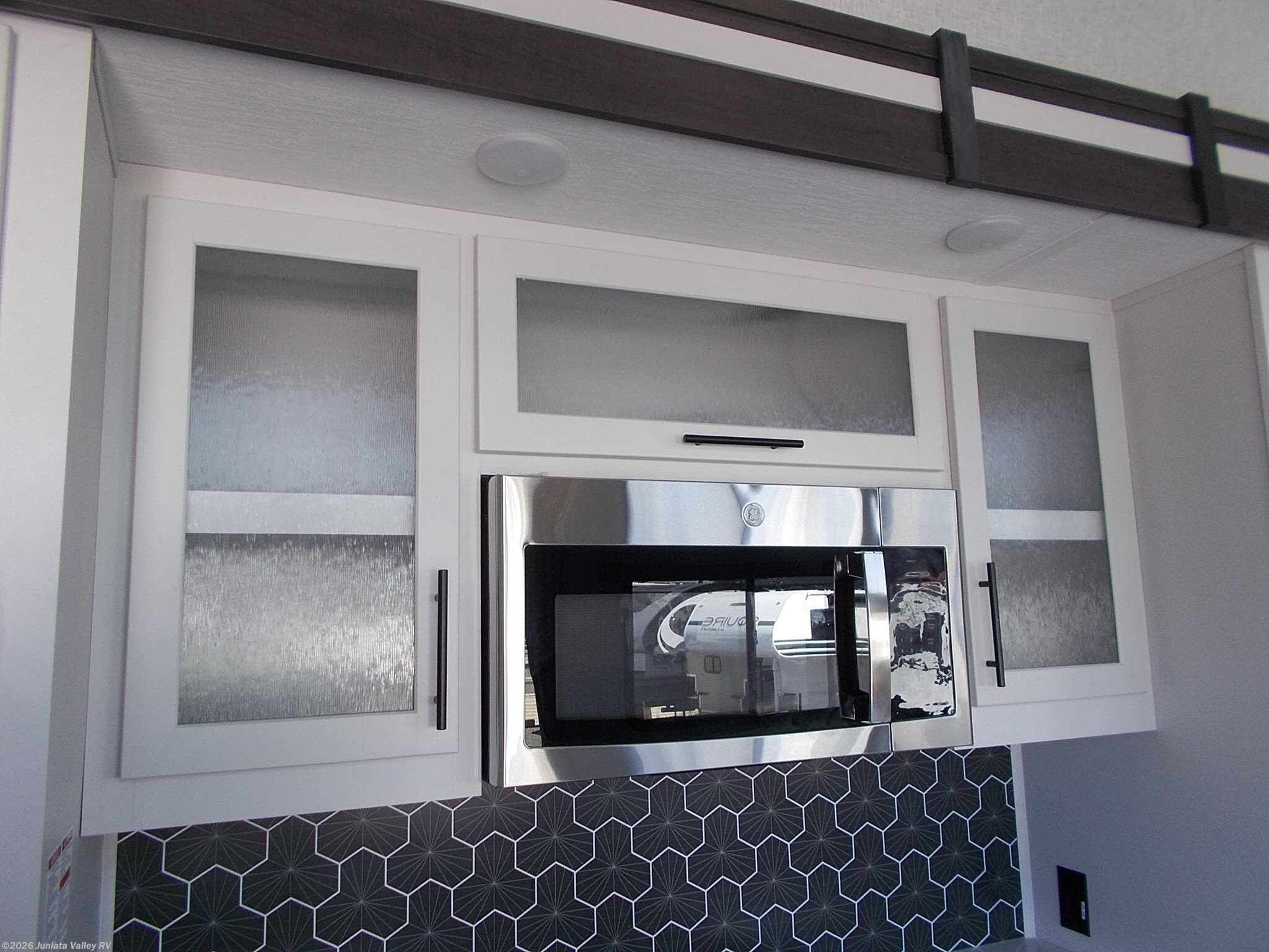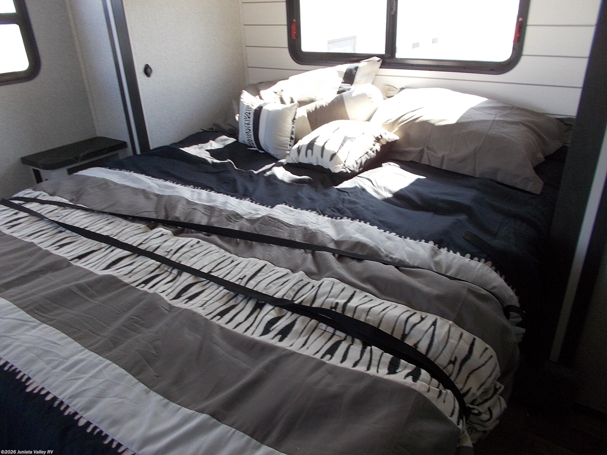 The well-appointed kitchen is complete with a microwave, oven, stove top burner, refrigerator, and a water heater, providing all the conveniences of home. The unit boasts a 54-gallon fresh water tank, along with 40-gallon black and grey water capacities, supporting extended stays. Climate control is handled by a 30,000 BTU air conditioner, ensuring a comfortable environment regardless of the weather. Additional comforts include ceiling fans and roof vents that enhance airflow and ventilation.