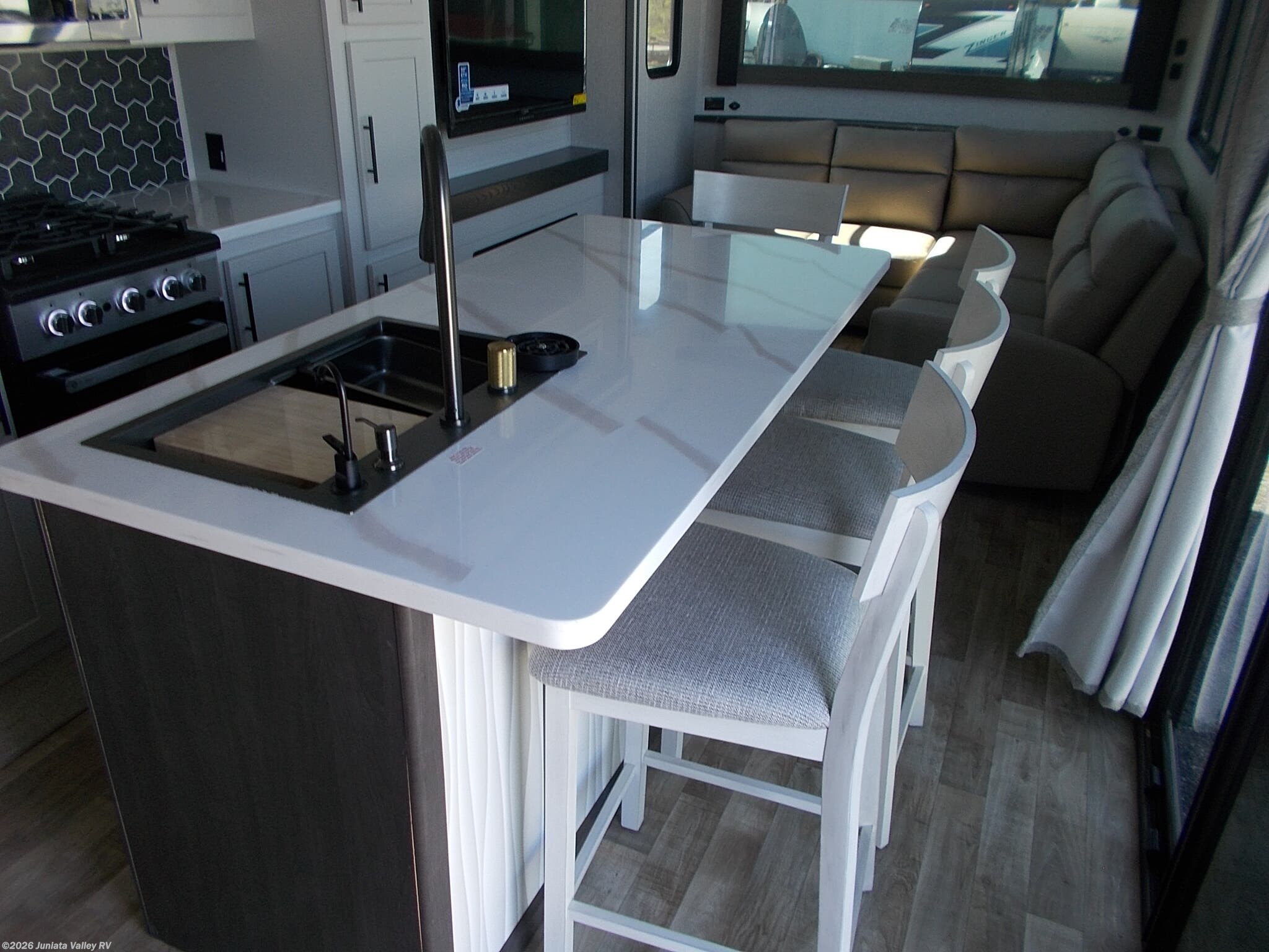 This destination trailer accommodates up to four sleepers comfortably, making it perfect for family getaways or group retreats. Inside, the Hampton offers luxurious features such as a king-size bed, rocker recliners, and a cozy fireplace that creates a warm and inviting atmosphere. The interior's modern design, coupled with a stylish interior color palette, elevates your camping experience.