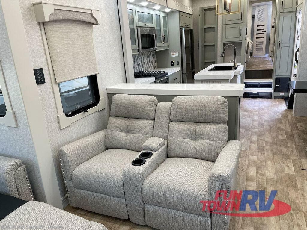 This Redwood fifth wheel is going to make you say wow! The rear living room is fully impressive with its 72" tri-fold sofa slides that are across from one another, its 60" theater sofa, its entertainment center with 65" TV, and its ceiling fan. All in all, it will feel like you're lounging back at home. The kitchen is also completely decked out with opposing slides, a pull-out waste basket at the large island, two buffets, a pantry, and a message center, and just a few steps away from the kitchen is where you will find the luxurious master suite. This space has a full bathroom up at the front where you will find a huge walk-in closet, and within the bedroom, the king bed slide rests across from the 39" TV so that you can watch a movie in comfort.