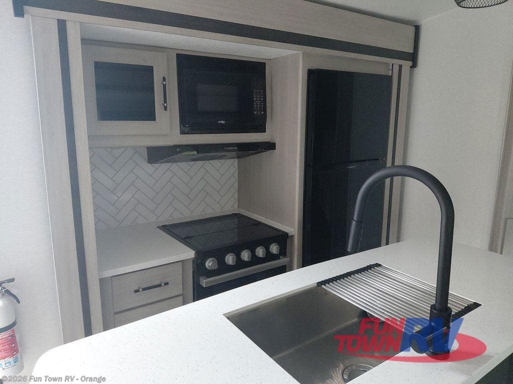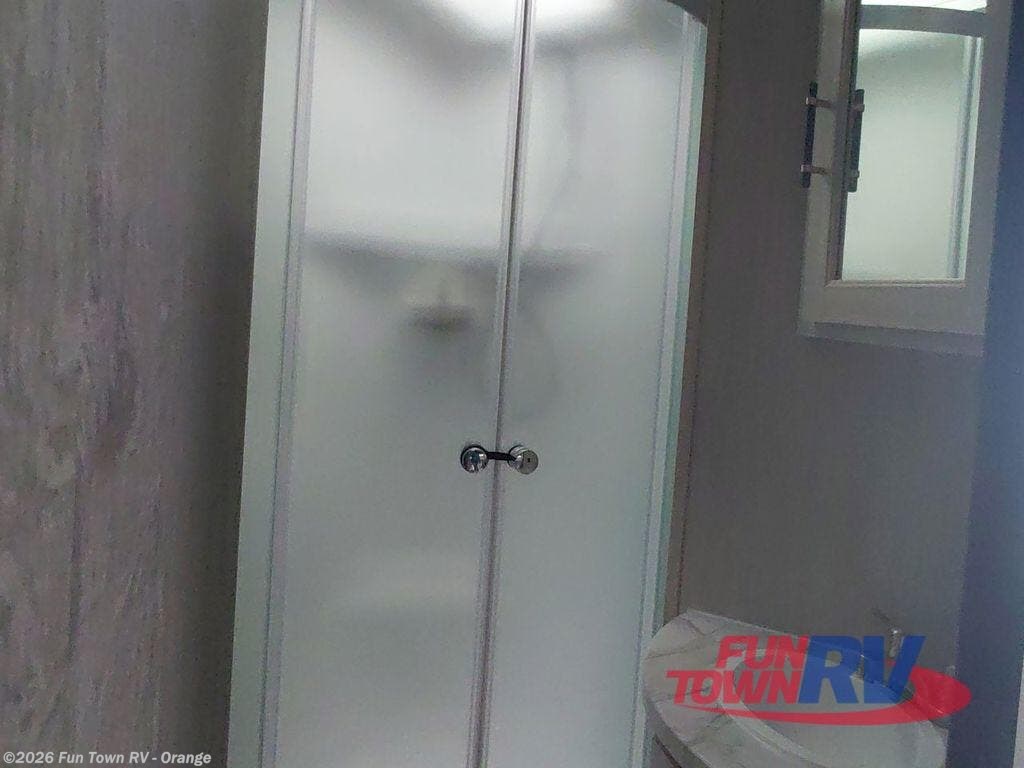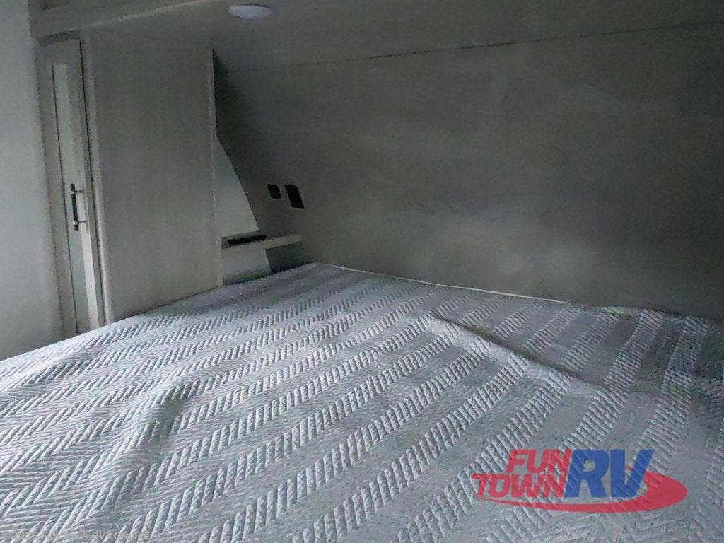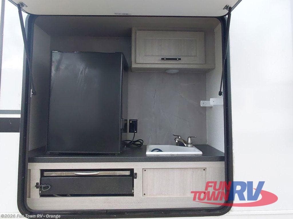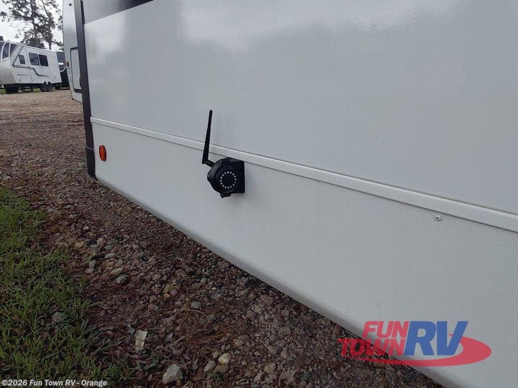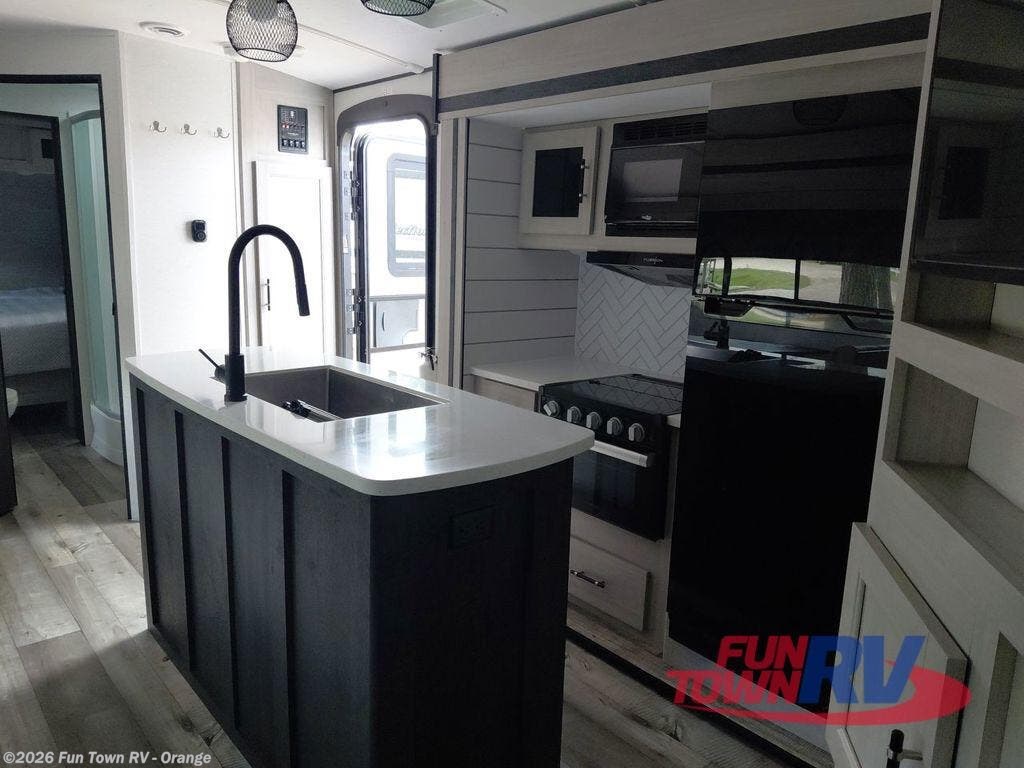 This travel trailer is packed with convenient features and luxury comforts for a camping trip you won't soon forget. Once you arrive at the campground, put out the electric awning and make a quick lunch on the exterior camp kitchen. The kitchen island inside will be the perfect place to cut up all the fixings for the burgers and you can grab the chips from the pantry. The kids will love the private bunkhouse that includes two bunks, a jackknife sofa with a kick, plus a dual entry half bath for convenience. The full walk-through bath will create a front master bedroom you are sure to love. Here, the king bed will provide a great night's rest and there are dual wardrobes for all your clothes.