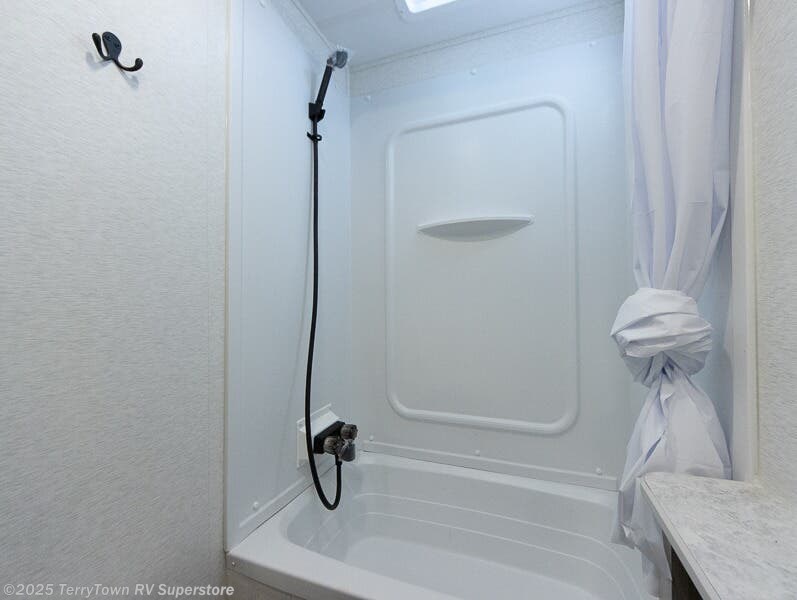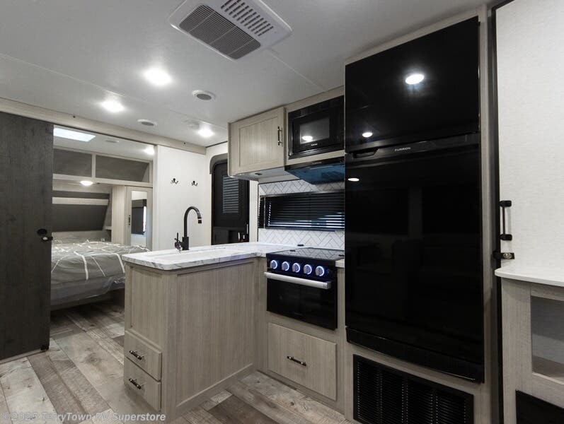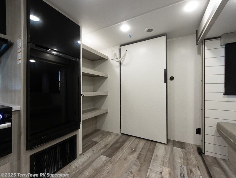 This spacious travel trailer is perfect for the group who loves to travel and camp. You'll have the front private bedroom all to yourselves that includes a queen bed, dual wardrobes and dual shelves to keep your space tidy. There is also a 36" sliding door that will save on space! Your guests or kids can sleep on the double-size bunks, and the full bath with a tub is right next to the bunks for easy nighttime use. The combined kitchen and living area will be a favorite place to hang out with its large slide out, 60" sofa and booth dinette, plus a fireplace with a hidden pantry behind for snacks galore!