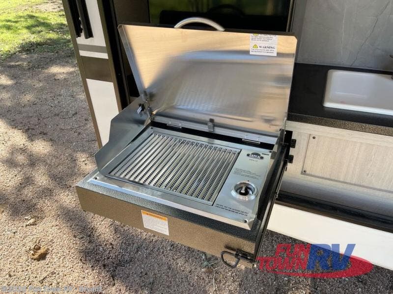 You will love the added interior space you have in this travel trailer thanks to the large slide out in the main living area. Here, you'll enjoy playing cards at the XL booth dinette and relaxing on the tri-fold sofa. Make home-cooked meals on the glass top range or use the exterior camp kitchen. There is even an exterior refrigerator for cold drinks, and the power awning will shade you from the hot summer sun. This model features a full rear bath for added privacy, and the shower skylight will allow natural light in. The front private bedroom includes a king bed, dual wardrobes, plus a shoe storage and pet station for your convenience!