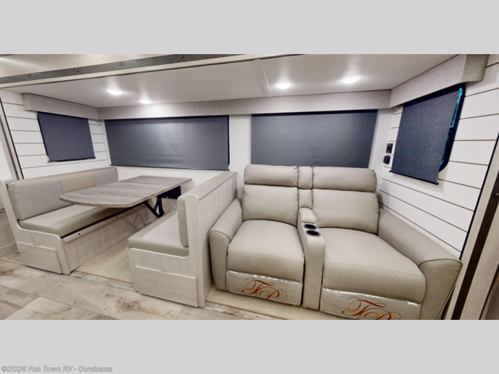 What could be more comfortable than a king bed, dual opposing slides for added space, plus an exterior camp kitchen? You will get all that and more when you choose this spacious travel trailer. The chef of the family will love the kitchen island for added space to cook and clean up, and there is plenty of rear counter space to set out fresh fruits and veggies. The tri-fold sofa sits directly across from the fireplace for a cozy evening indoors, and if you're not needing the extra sleeping space you can choose the optional theater seating in place of the tri-fold sofa. You will truly feel at home in the front private bedroom that includes a king bed, dual wardrobes, plus a third wardrobe in the closet. There is even a pet station that will make camping with your dog easier than ever!