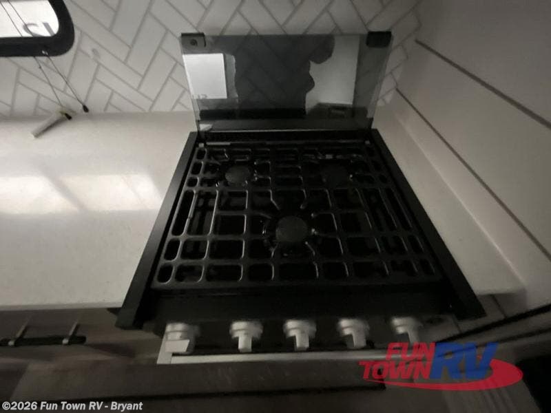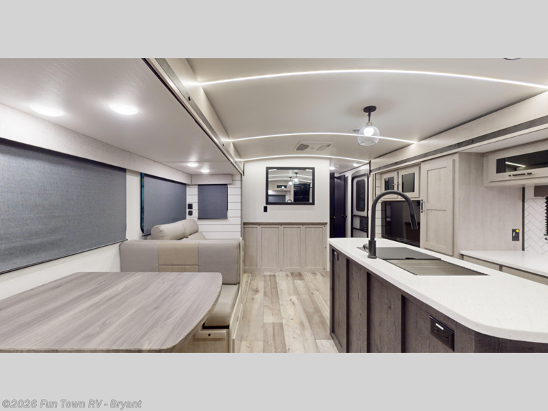 What could be more comfortable than a king bed, dual opposing slides for added space, plus an exterior camp kitchen? You will get all that and more when you choose this spacious travel trailer. The chef of the family will love the kitchen island for added space to cook and clean up, and there is plenty of rear counter space to set out fresh fruits and veggies. The tri-fold sofa sits directly across from the fireplace for a cozy evening indoors, and if you're not needing the extra sleeping space you can choose the optional theater seating in place of the tri-fold sofa. You will truly feel at home in the front private bedroom that includes a king bed, dual wardrobes, plus a third wardrobe in the closet. There is even a pet station that will make camping with your dog easier than ever!