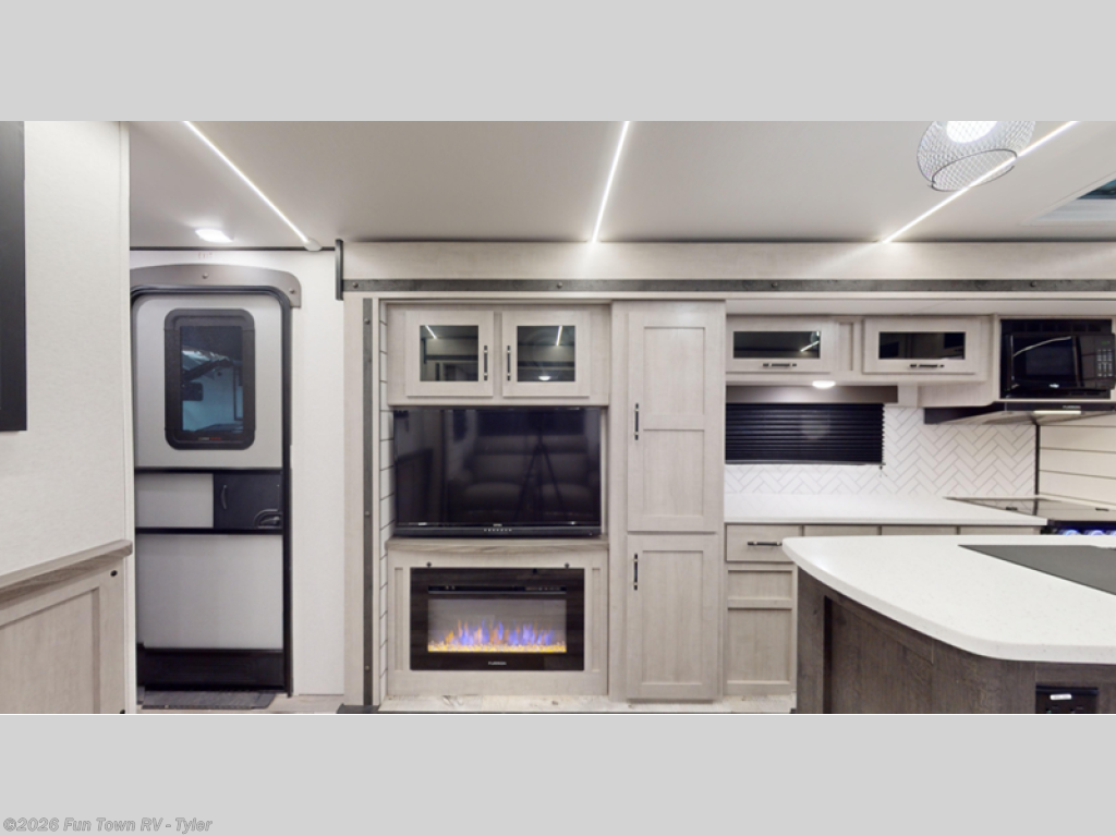 What could be more comfortable than a king bed, dual opposing slides for added space, plus an exterior camp kitchen? You will get all that and more when you choose this spacious travel trailer. The chef of the family will love the kitchen island for added space to cook and clean up, and there is plenty of rear counter space to set out fresh fruits and veggies. The tri-fold sofa sits directly across from the fireplace for a cozy evening indoors, and if you're not needing the extra sleeping space you can choose the optional theater seating in place of the tri-fold sofa. You will truly feel at home in the front private bedroom that includes a king bed, dual wardrobes, plus a third wardrobe in the closet. There is even a pet station that will make camping with your dog easier than ever!