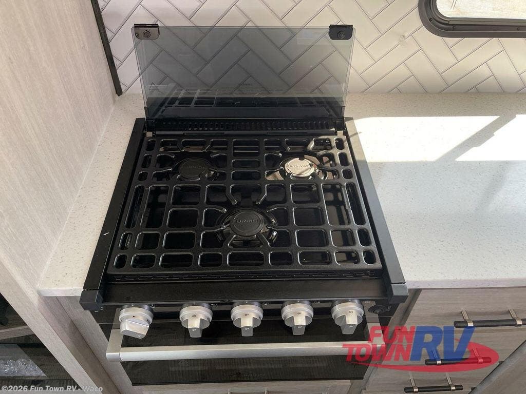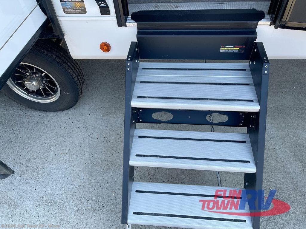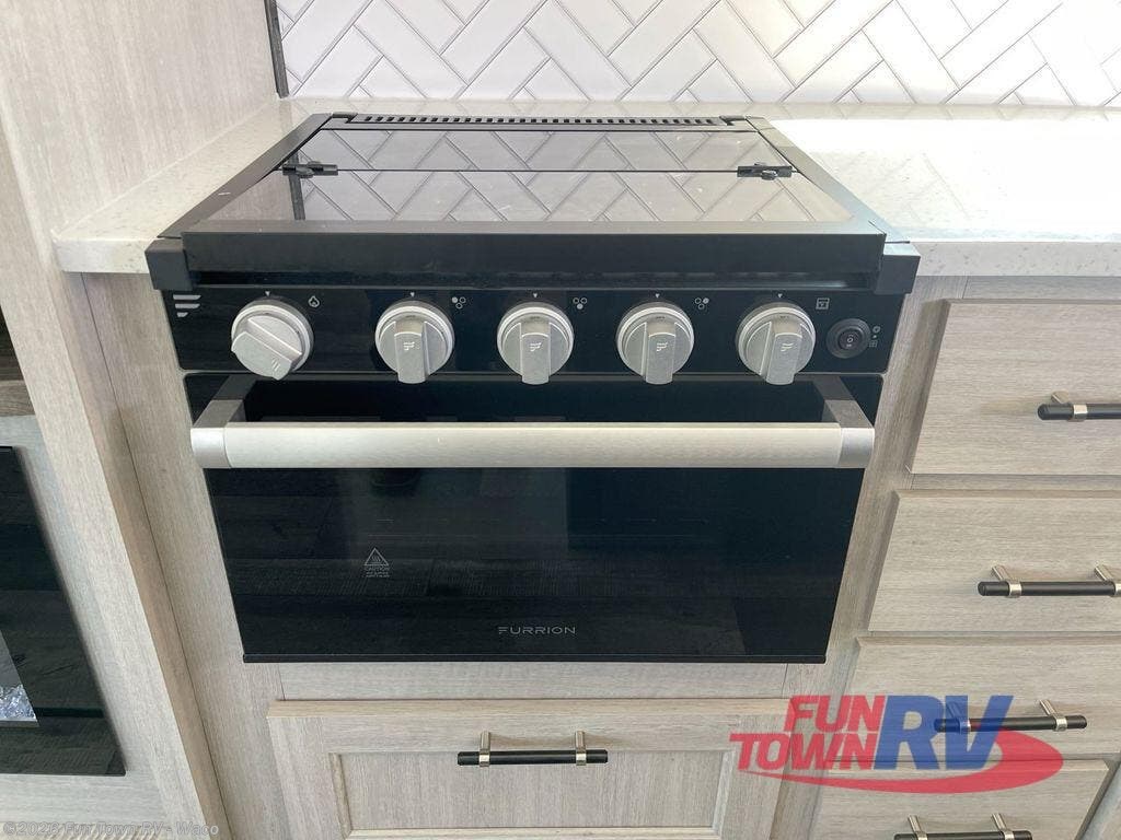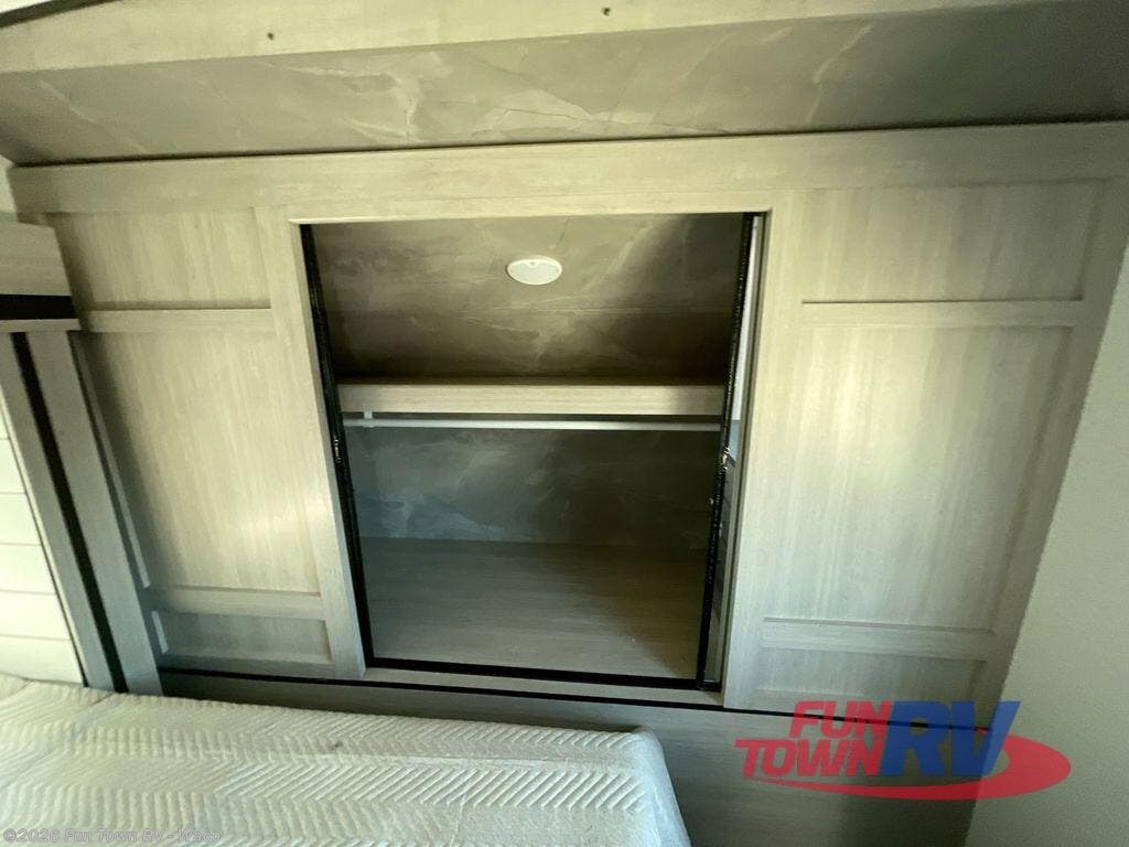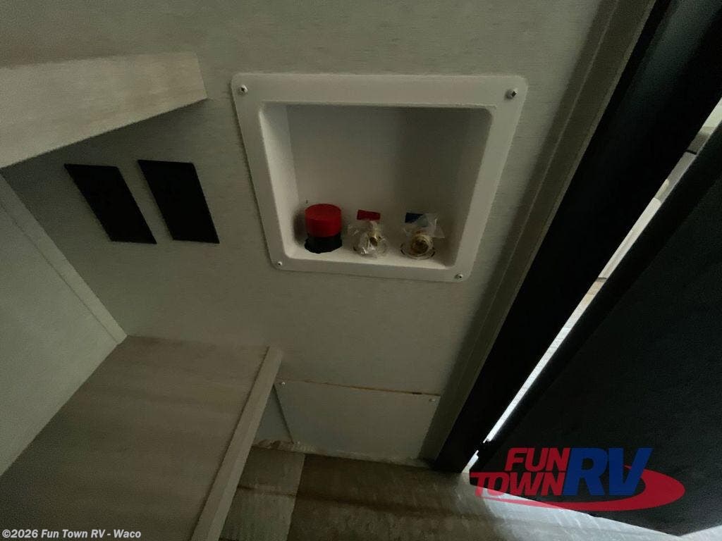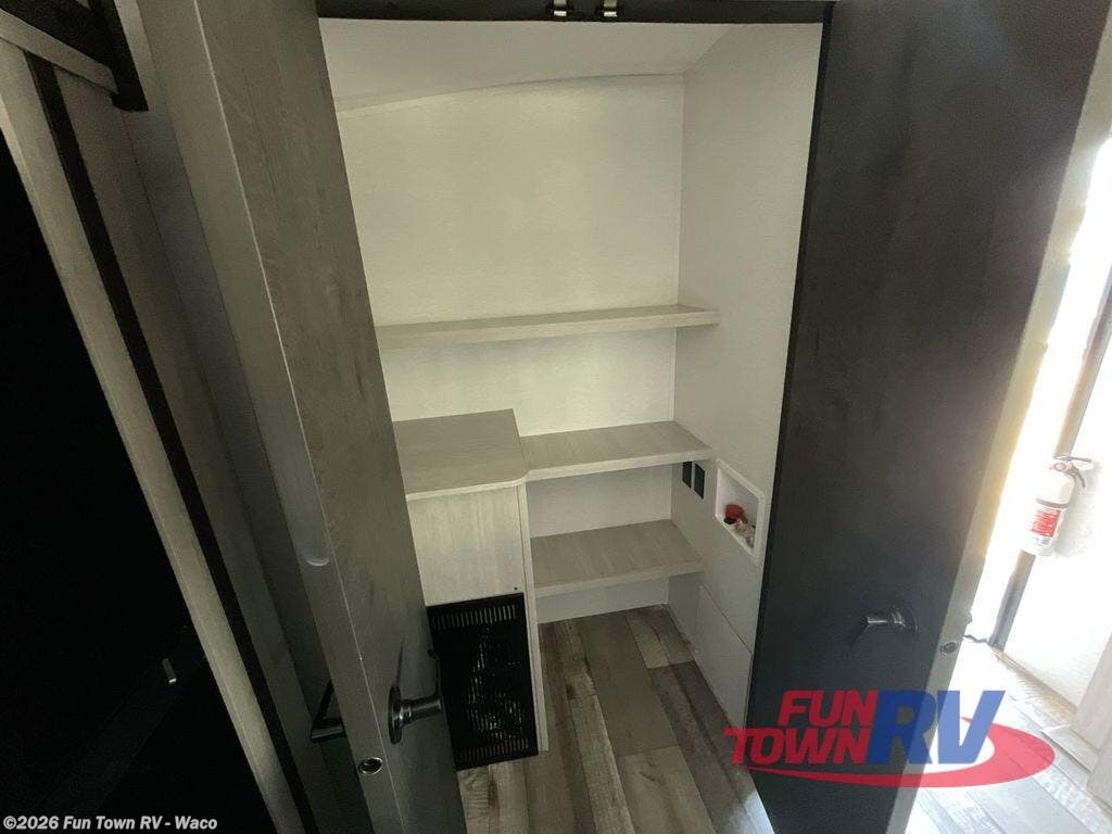 This spacious travel trailer is beaming with luxurious features you are sure to love. The dual opposing slides in the main living area open up the whole space, plus there is a third slide out in the front master suite. The chef of the family will appreciate the kitchen island for additional counter space, and there is a large pantry for all your non-perishables. This space has also been prepped to add an optional washer and dryer if you choose. Your family will find plenty of seating space on the rear 82" tri-fold sofa, the XL booth dinette, and the theater seating. The dual entry bath creates a front master bedroom, and you'll find plenty of storage space here, including a chest of drawers and a large front shelf!