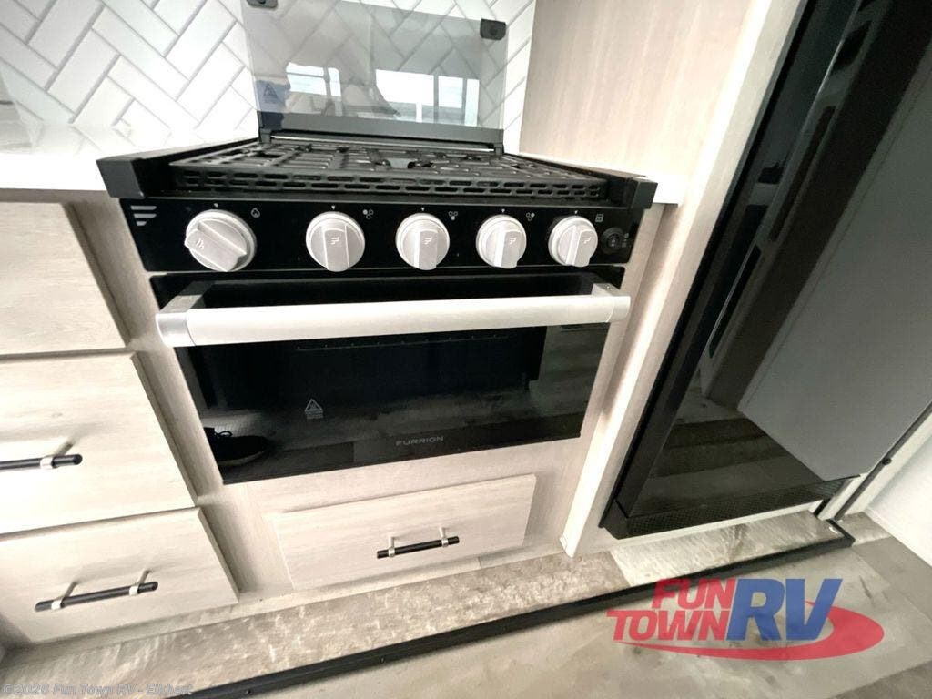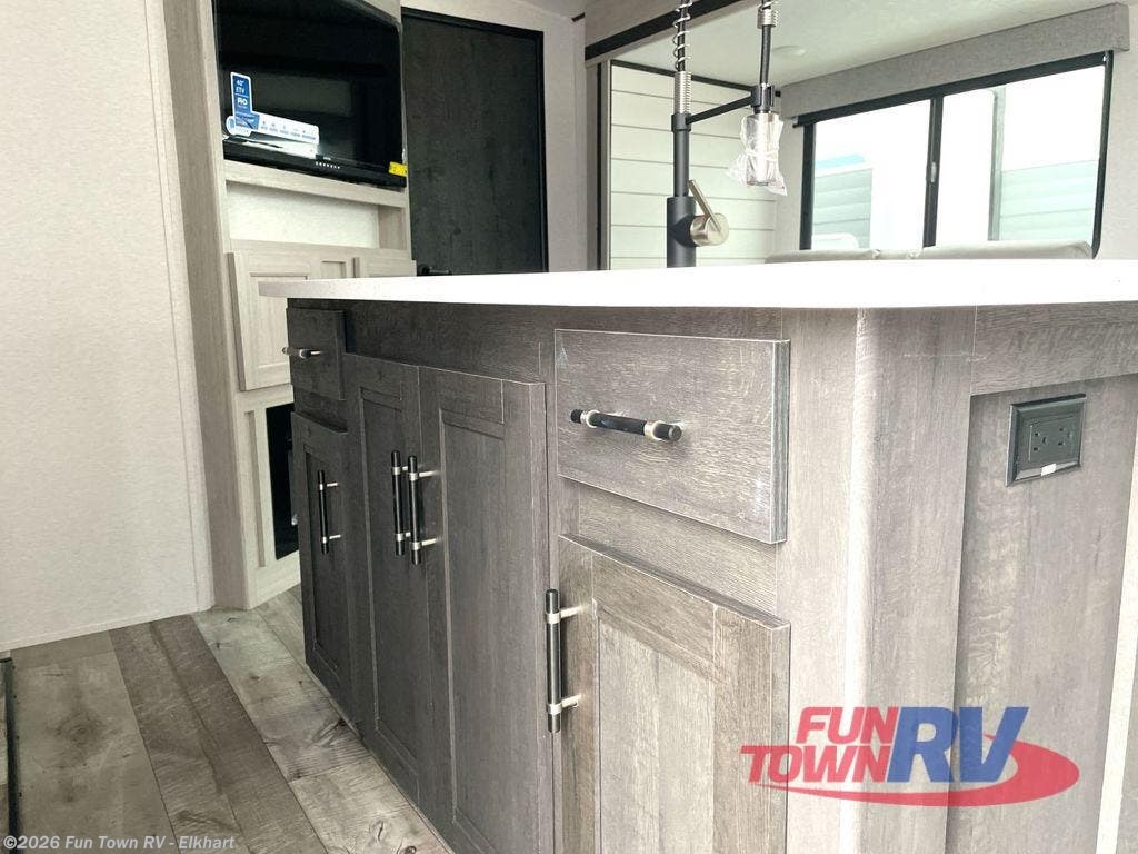 This travel trailer is packed with convenient features and luxury comforts for a camping trip you won't soon forget. Once you arrive at the campground, put out the electric awning and make a quick lunch on the exterior camp kitchen. The kitchen island inside will be the perfect place to cut up all the fixings for the burgers and you can grab the chips from the pantry. The kids will love the private bunkhouse that includes two bunks, a jackknife sofa with a kick, plus a dual entry half bath for convenience. The full walk-through bath will create a front master bedroom you are sure to love. Here, the king bed will provide a great night's rest and there are dual wardrobes for all your clothes.
