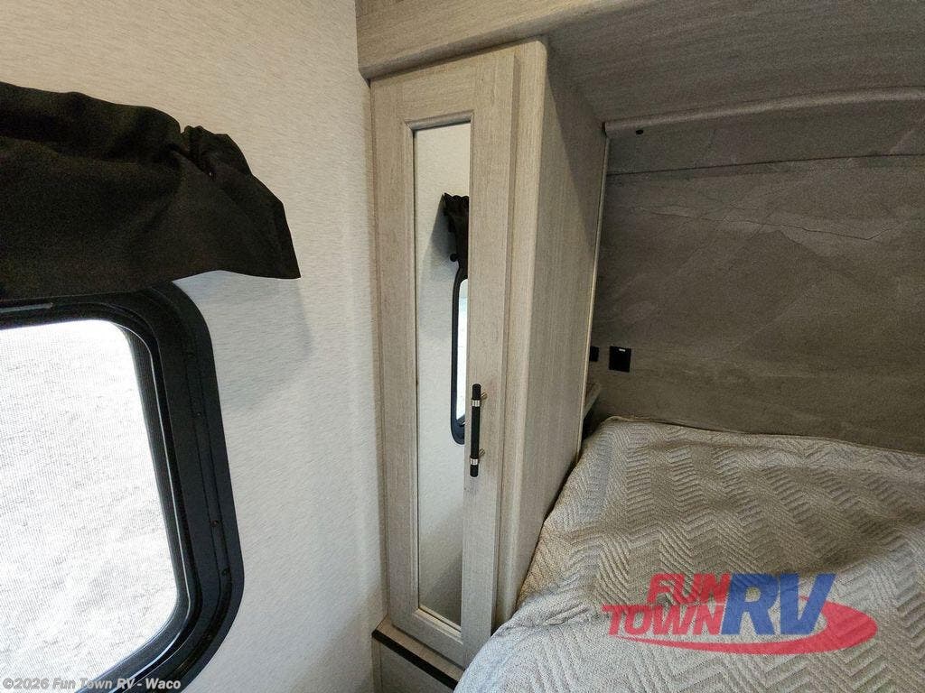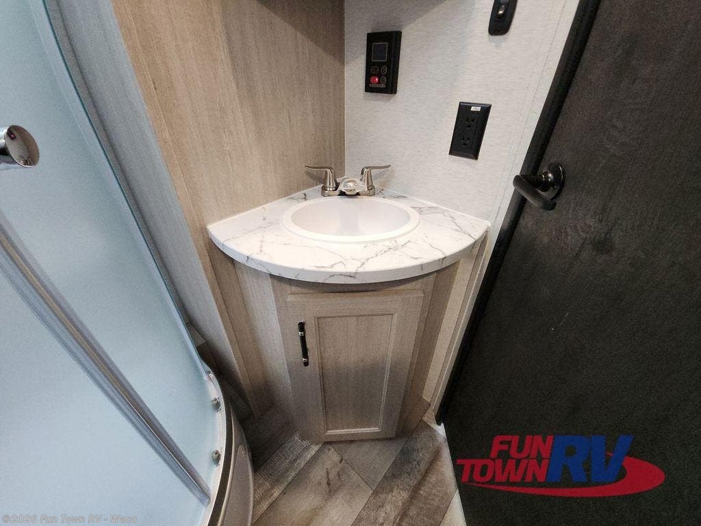 This travel trailer is packed with convenient features and luxury comforts for a camping trip you won't soon forget. Once you arrive at the campground, put out the electric awning and make a quick lunch on the exterior camp kitchen. The kitchen island inside will be the perfect place to cut up all the fixings for the burgers and you can grab the chips from the pantry. The kids will love the private bunkhouse that includes two bunks, a jackknife sofa with a kick, plus a dual entry half bath for convenience. The full walk-through bath will create a front master bedroom you are sure to love. Here, the king bed will provide a great night's rest and there are dual wardrobes for all your clothes.