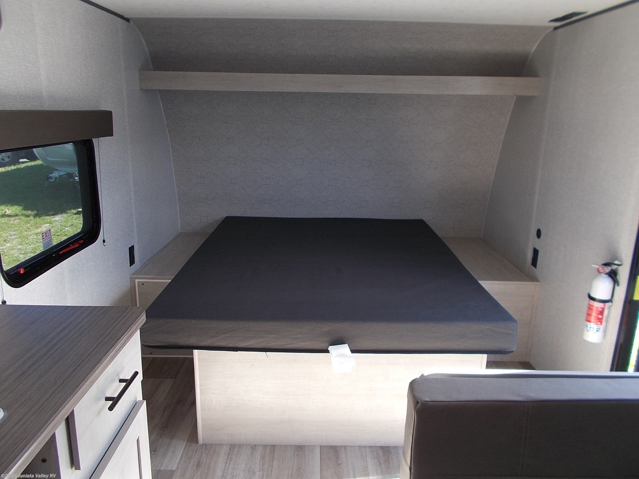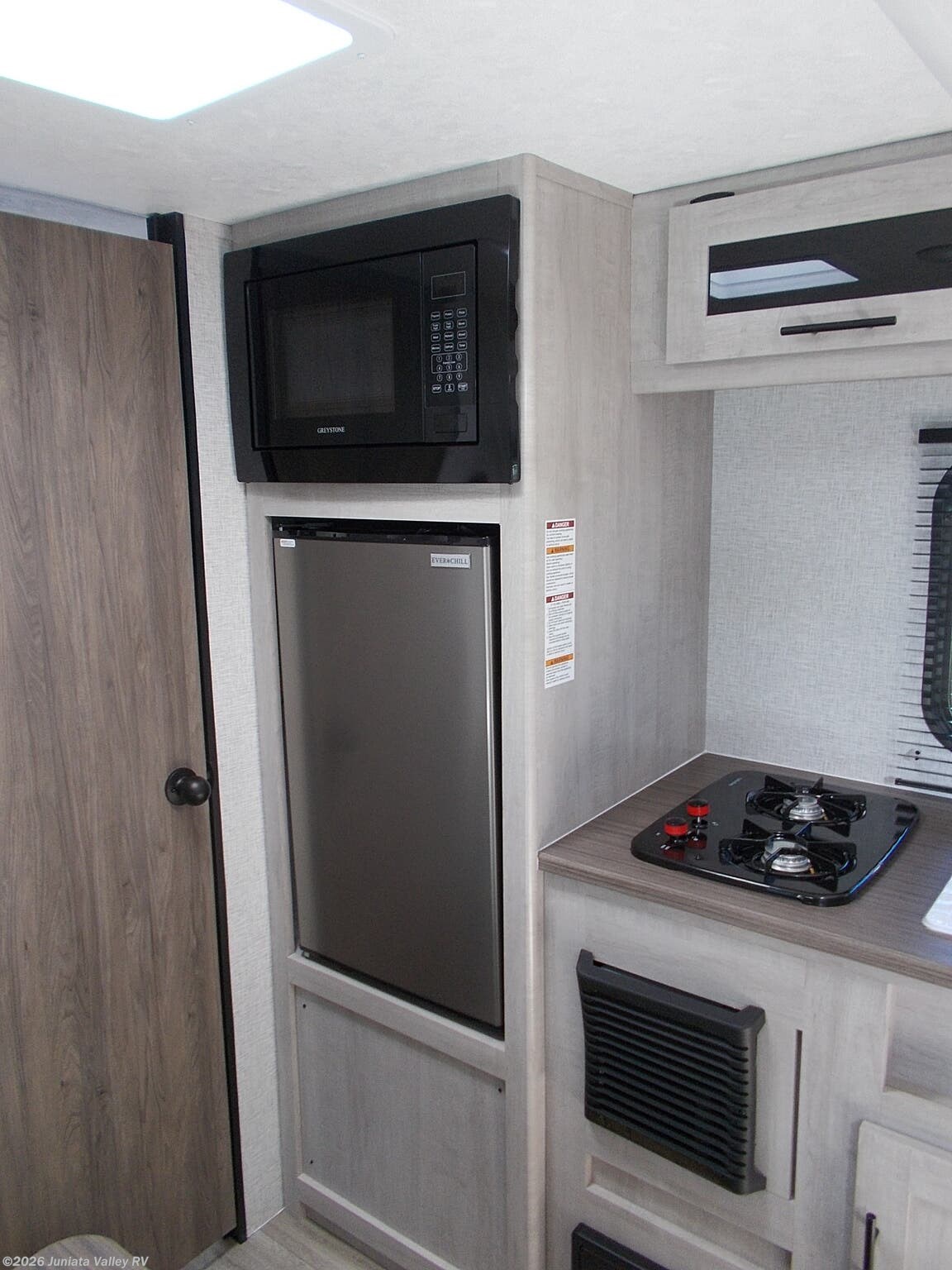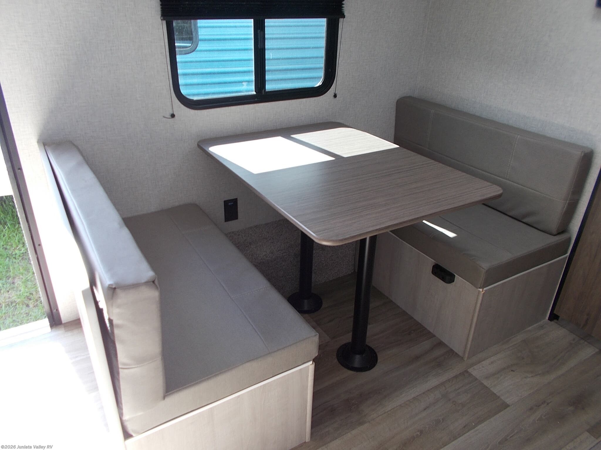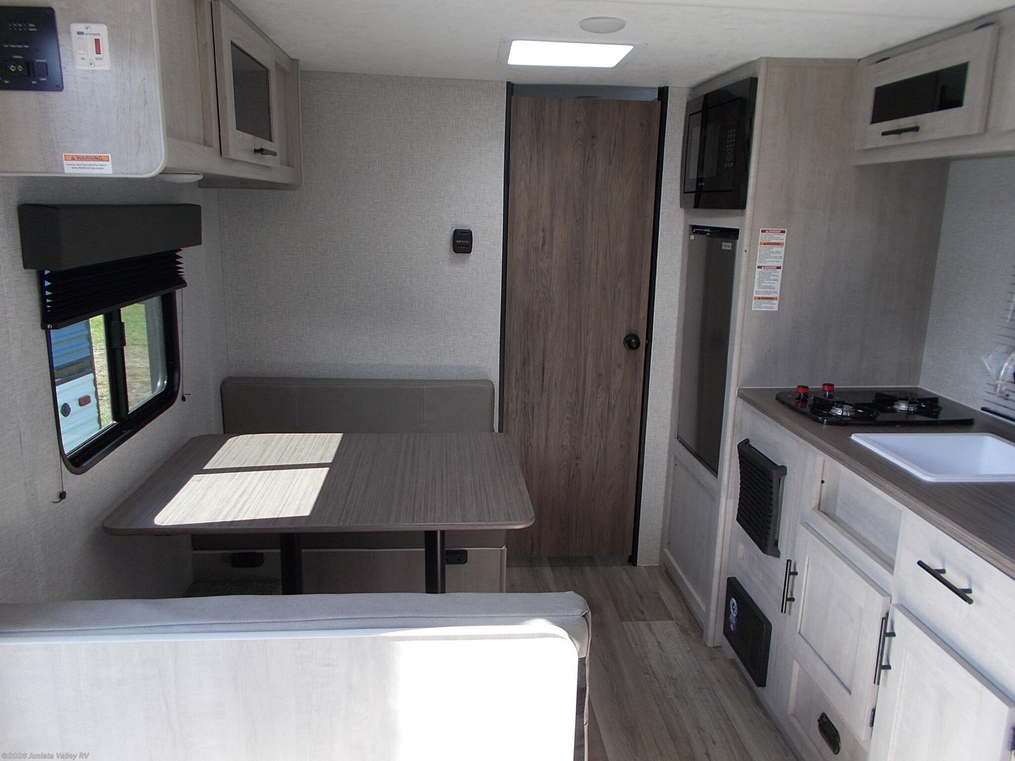 The Zinger 18RB blends comfort with practicality. Inside, you’ll find a well-organized living area with overhead cabinetry, a booth dinette (which converts to a bed) for flexible seating and sleeping, and a cozy queen bed with a dedicated queen mattress. The kitchen is equipped for everyday meals, featuring a stove top burner, microwave, and a refrigerator (plus a 12V refrigerator option for off-grid convenience). A self-contained system with a water heater and furnace keeps you warm and comfortable, while LED lighting creates a bright, energy-efficient interior.