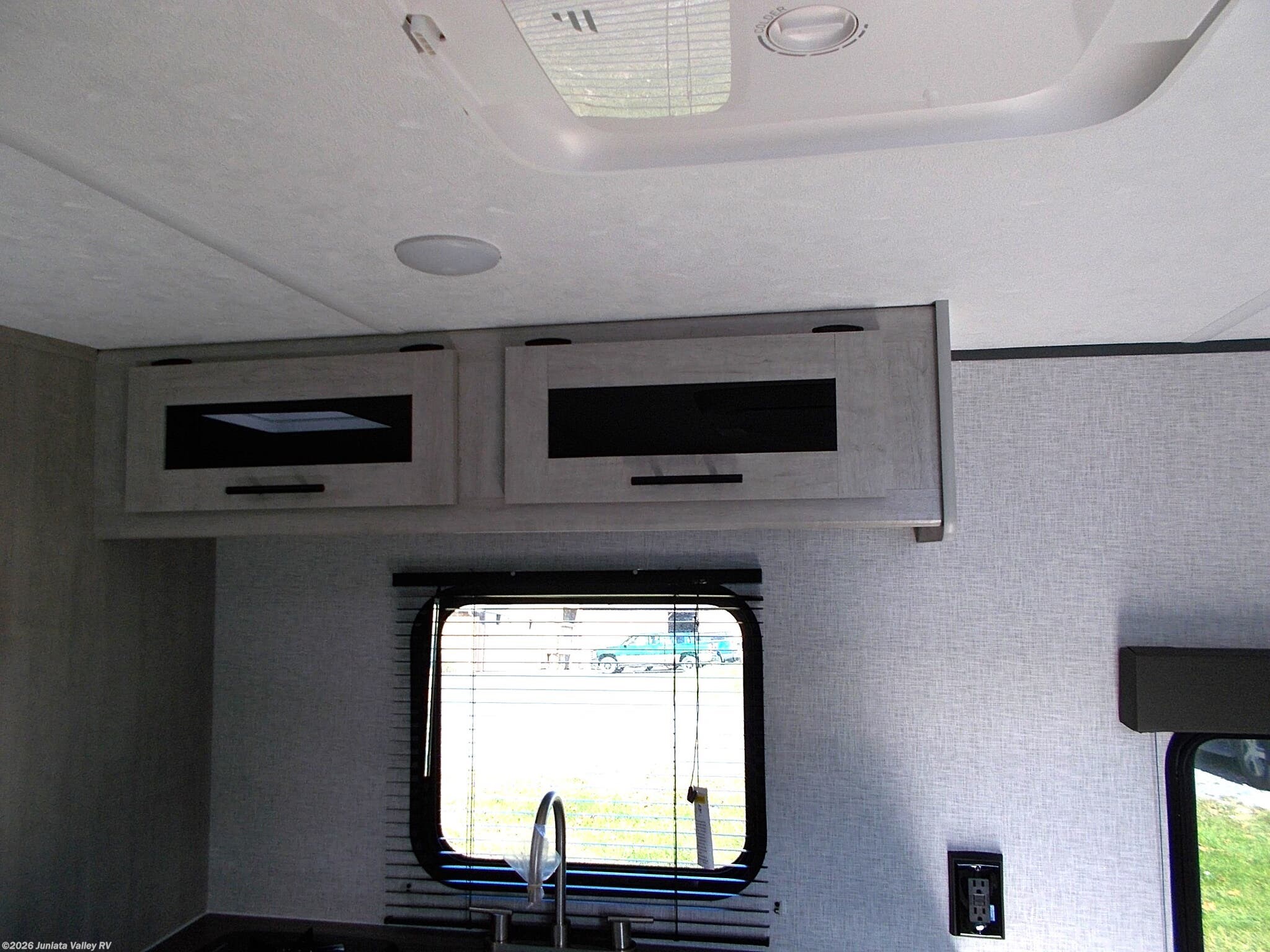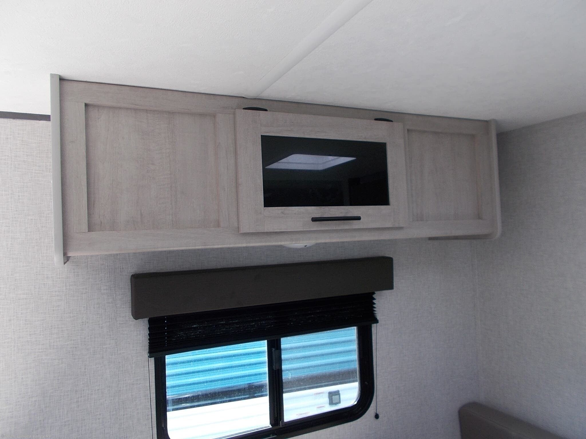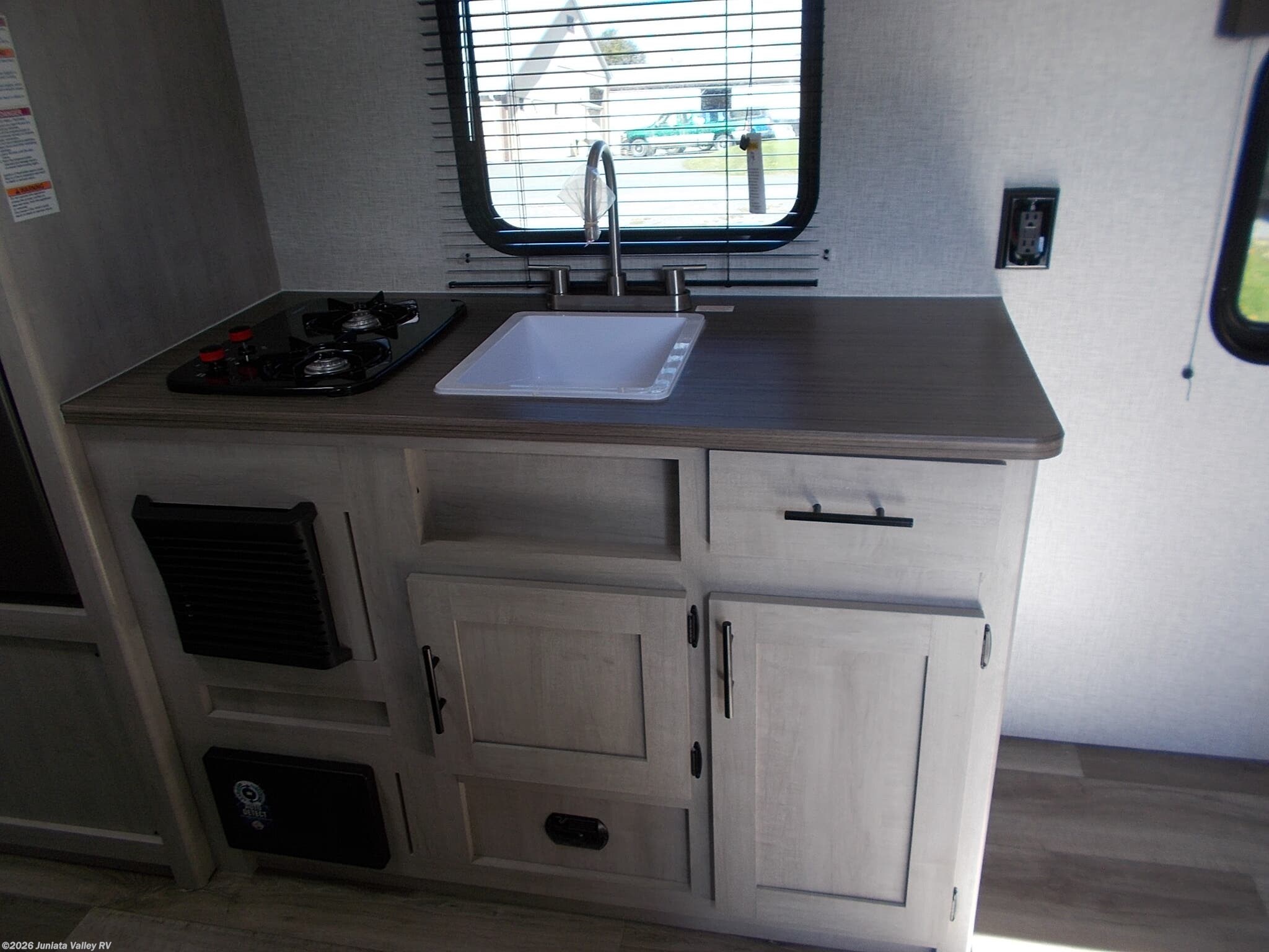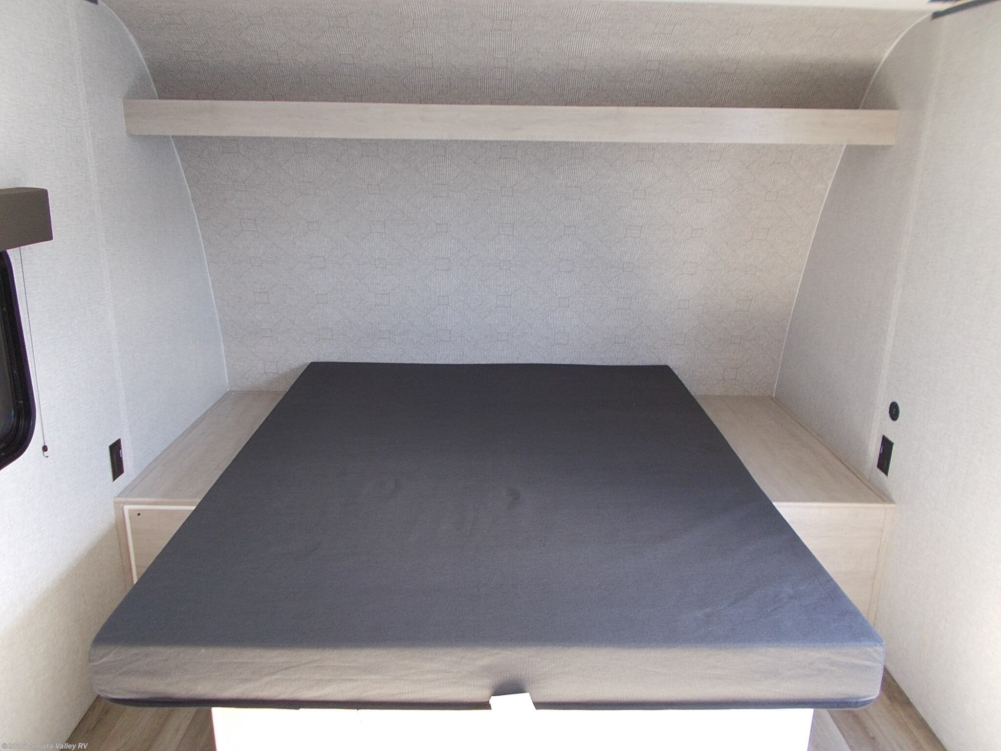 The Zinger 18RB blends comfort with practicality. Inside, you’ll find a well-organized living area with overhead cabinetry, a booth dinette (which converts to a bed) for flexible seating and sleeping, and a cozy queen bed with a dedicated queen mattress. The kitchen is equipped for everyday meals, featuring a stove top burner, microwave, and a refrigerator (plus a 12V refrigerator option for off-grid convenience). A self-contained system with a water heater and furnace keeps you warm and comfortable, while LED lighting creates a bright, energy-efficient interior.