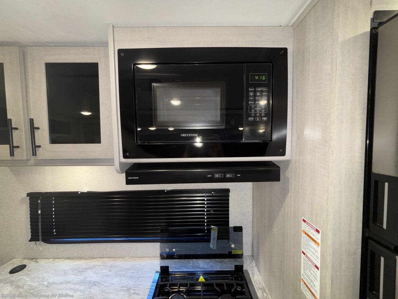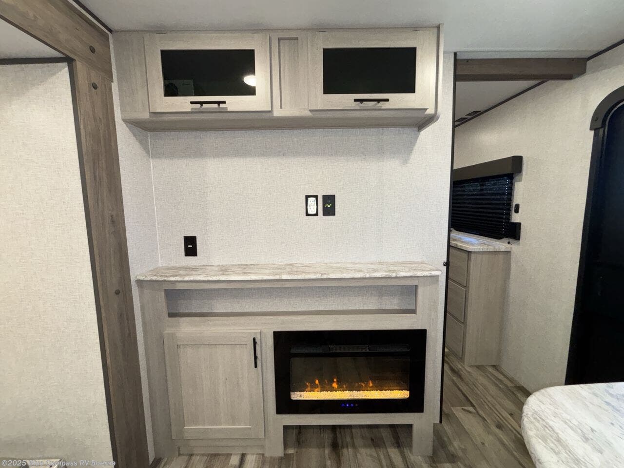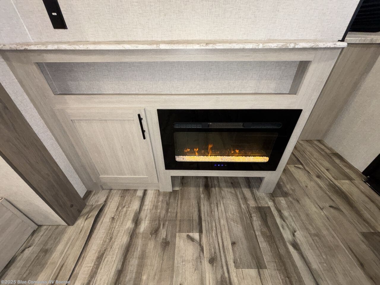 Camp like royalty in this travel trailer! The front private bedroom features a king bed across from a dresser and next to a large wardrobe with overhead cabinets, plus there is a closet with washer and dryer prep. The living area has a 60" jackknife sofa that can be pulled out for a comfortable place to lie down and watch a movie on the HDTV while a fire is roaring in the electric fireplace. The rear private bunkhouse is big enough to house all of the kiddos with the 38" x 74" flip-up bunk above the 72" jackknife sofa and the 38" x 74" bunk above the wardrobe/entertainment center. You can even cook dinner while breathing in fresh air at the outdoor kitchen!
