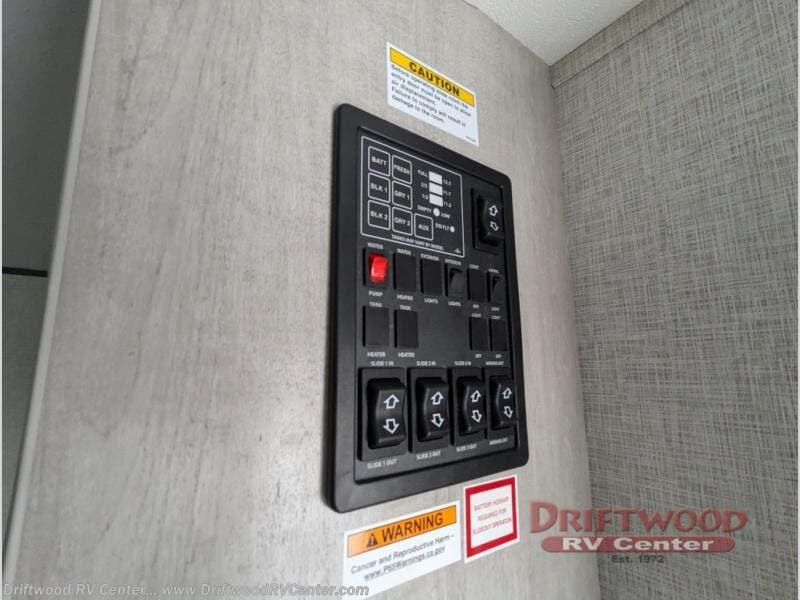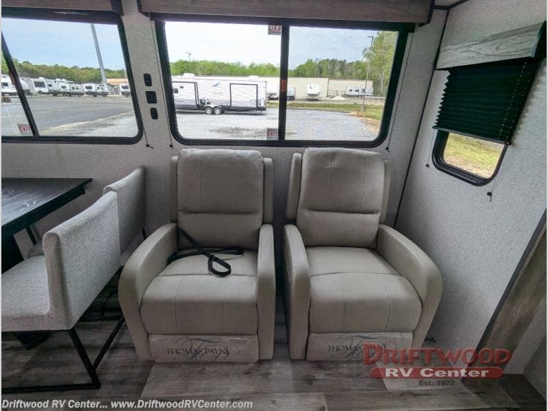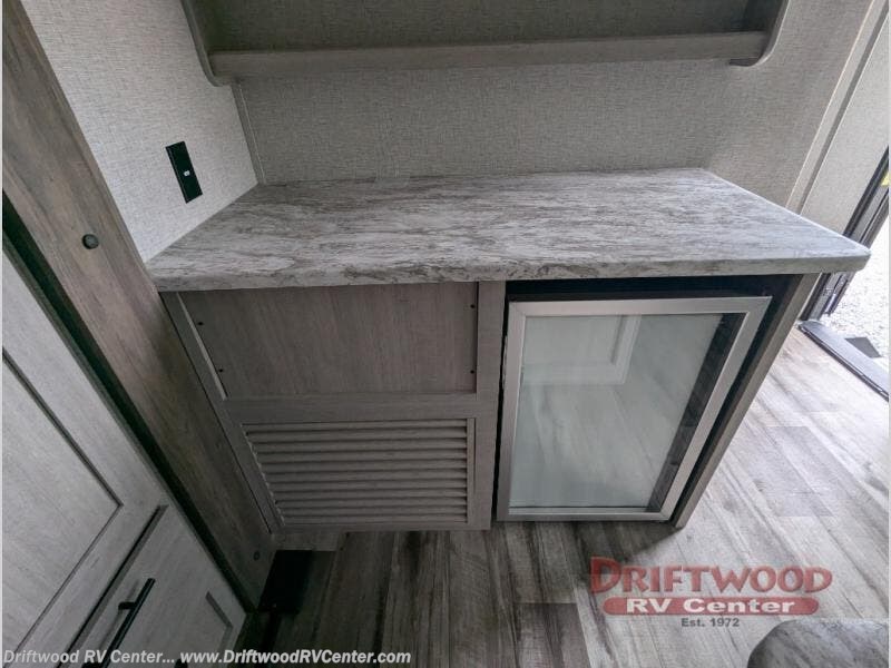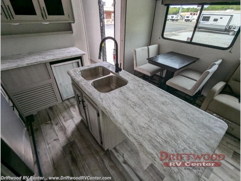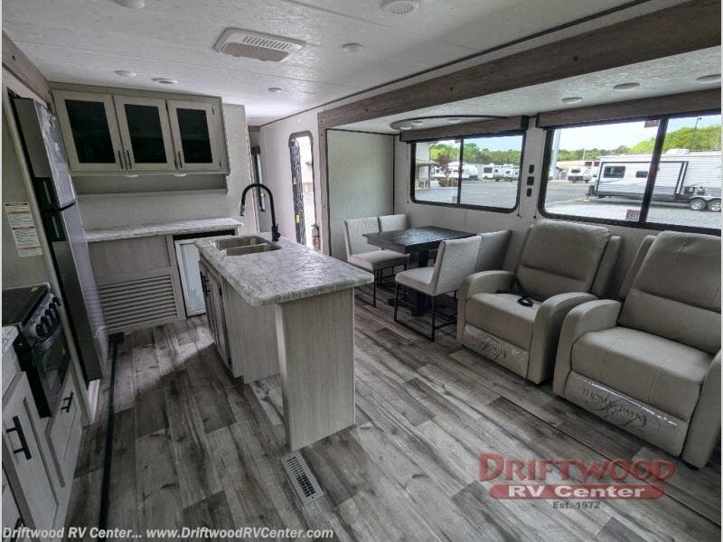 If you and your spouse wish to escape the hustle and bustle of everyday life, then you need this travel trailer! The rear living area is filled with relaxation with a 72" jackknife sofa and two recliner chairs across from the entertainment center with a fireplace and a 39" TV. The kitchen is full of comforts too, including a kitchen island with a chair on either side of it, a 80" U-shaped dinette, and a wine cooler to keep your favorite drinks cool and crisp. You can get re-charged each night on the king bed inside the front private bedroom.