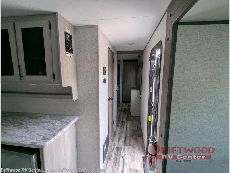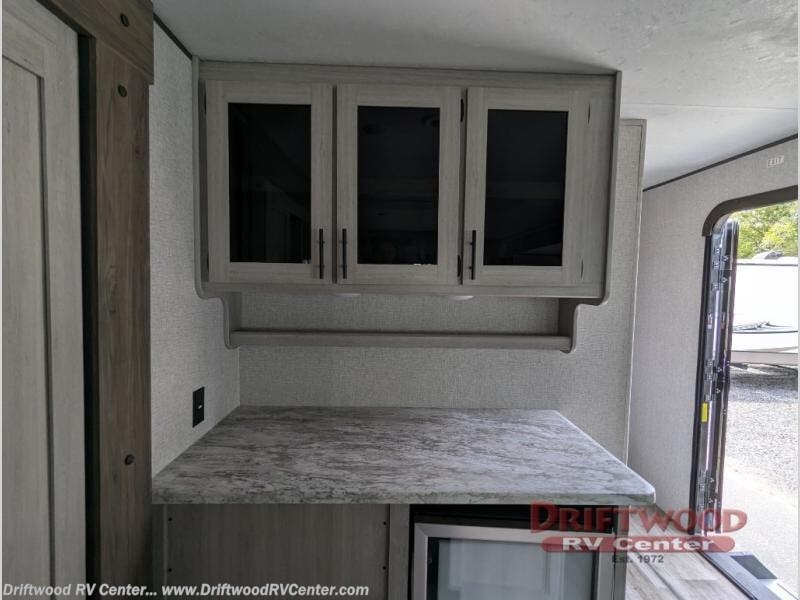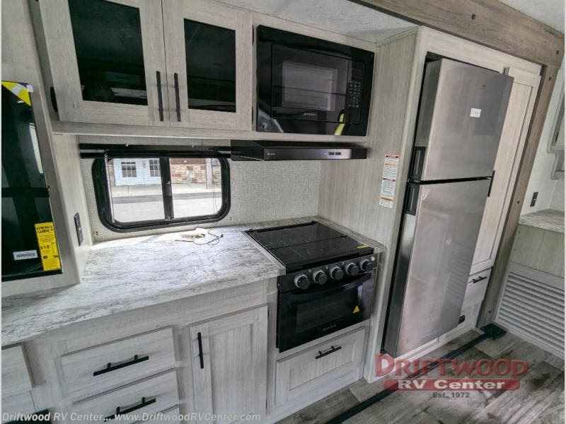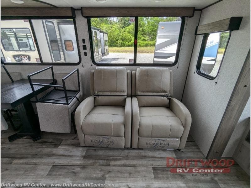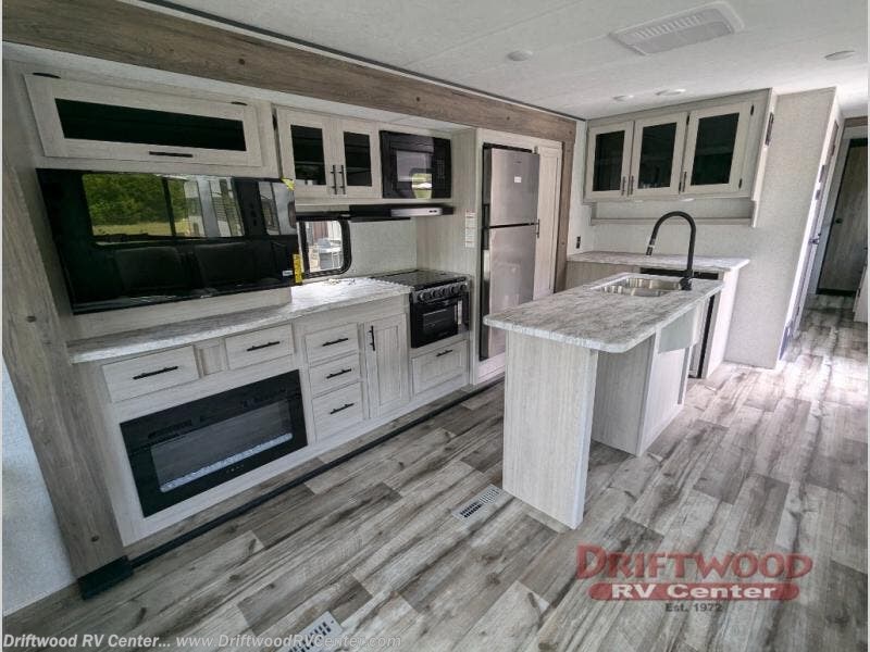 If you and your spouse wish to escape the hustle and bustle of everyday life, then you need this travel trailer! The rear living area is filled with relaxation with a 72" jackknife sofa and two recliner chairs across from the entertainment center with a fireplace and a 39" TV. The kitchen is full of comforts too, including a kitchen island with a chair on either side of it, a 80" U-shaped dinette, and a wine cooler to keep your favorite drinks cool and crisp. You can get re-charged each night on the king bed inside the front private bedroom.