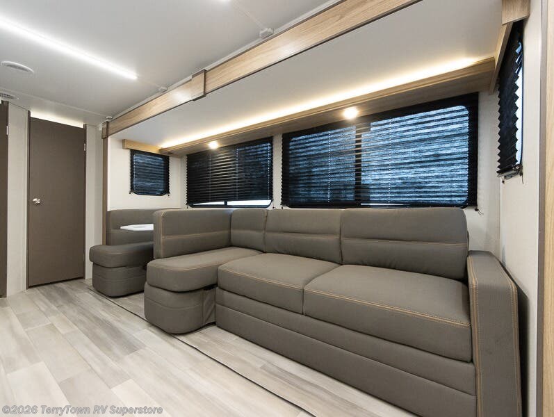 Sleeping for five or six depending on size makes this a great family trailer! A large slide in the combined kitchen and living room allows plenty of space for everyone to easily move around. Enjoy relaxing on the Lux Lounge which can also double as sleeping space for family or friends. There is also a 42" x 76" booth dinette for meals and games which can also be transformed into sleeping if needed. Both seating spaces can easily view the fireplace while relaxing inside. The queen bed in the front private bedroom will provide a great night's rest after adventuring all day, and in the morning you can create a hearty breakfast using the three burner cooktop. A spacious rear corner bath provides a radius shower, toilet, and sink so everyone can feel their best. On the outside, a full pass-through compartment features ample storage for camp chairs, an outdoor rug for under the 18' awning, and so much more!