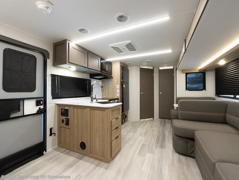 With any Avenir travel trailer by Cruiser RV, you will enjoy affordable luxury at every turn! The smooth corrugated metal exterior and industry leading 3X's full-height cross-members provide a durable foundation, and the Cruiser climate defense heated/enclosed underbelly helps extend your camping season. There is batten strip lighting with a dimmer, max storage in the deluxe curated kitchen, and thoughtfully located USB ports and 110V charging outlets to keep your electronics charged. A central control panel lets you easily access your units functions, and the Wi-Fi prep will give you the option to stay connected while you camp. Each model also features a tinted exterior glass door, an on-demand tankless water heater, solid flip-down steps with a telescoping handrail, and a roof mounted 50W solar panel with a 10A charge controller for added convenience.