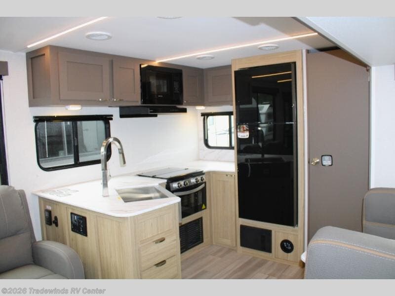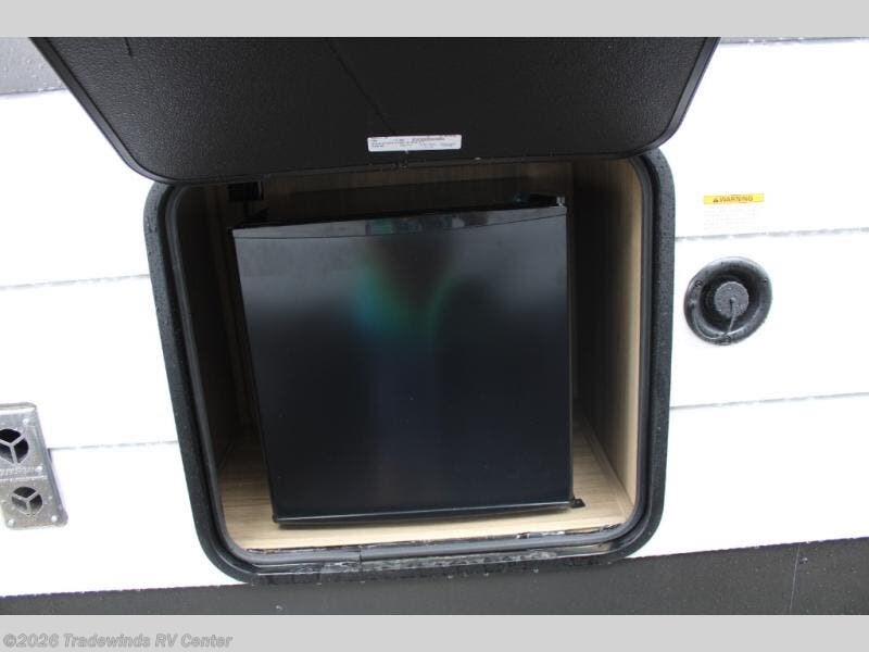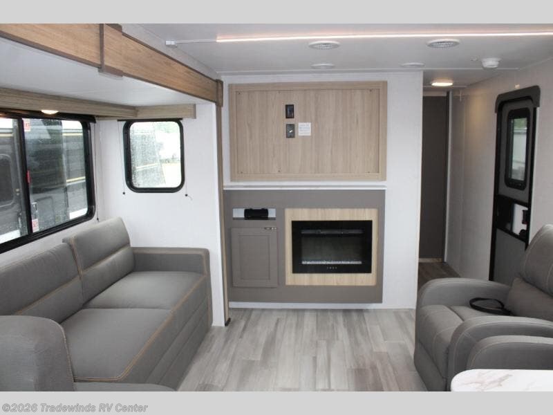 Start a new journey in this cozy travel trailer for five to six. The rear kitchen includes ample counter space to prep meals, a three burner cooktop, plus a spacious pantry where you can keep dry goods and snacks. There are two lounge chairs to relax on, along with a Lux Lounge, and a booth dinette. The fireplace is sure to make your space feel a little more like home, as well as the front private bedroom with a queen bed. The spacious full bath is close by the bedroom for convenience, and there is a bedroom wardrobe so you're not living out of a suitcase all weekend! You can unload your camping chairs from the full pass-through storage, grab a cold drink from the exterior refrigerator, and relax under the 18' patio awning!